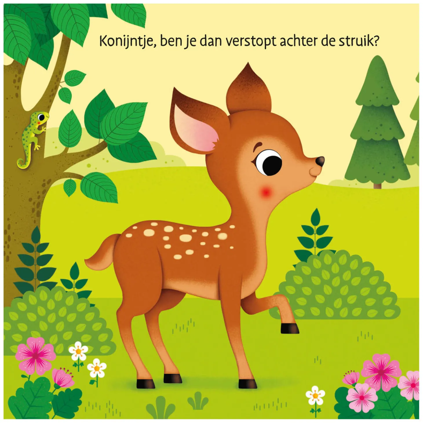 Een snoezig kijkboekje met zachte vilten flapjes voor de allerkleinsten. Waar heeft het konijntje zich verstopt? Speelt het in het stro? Of zit het tussen de bloemen? Kijk snel onder de vilten flapjes, ontdek een heleboel leuke dieren en zoek het kleine konijntje! Dit leuke kartonboekje breidt niet alleen de woordenschat van je kindje uit, maar stimuleert ook de fijne motoriek!