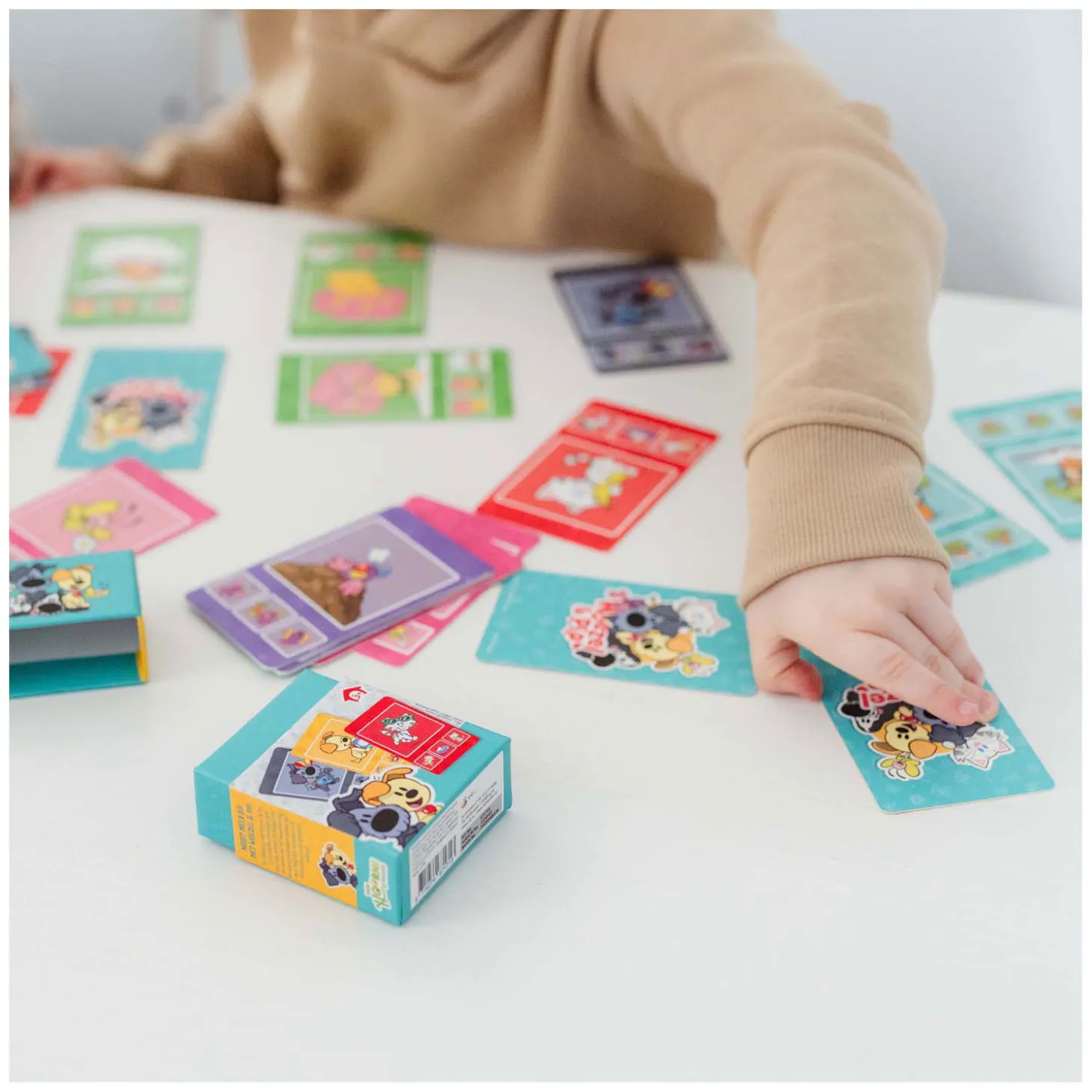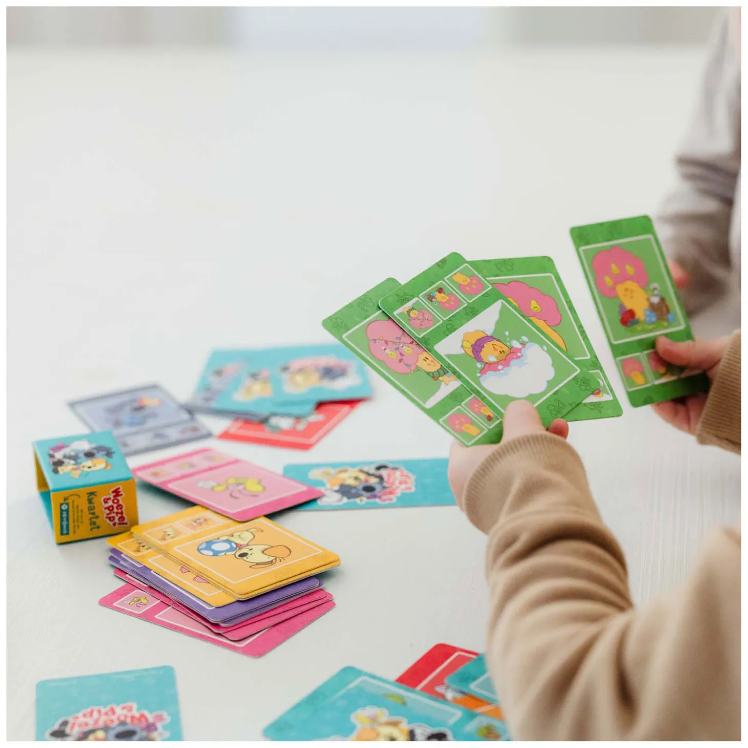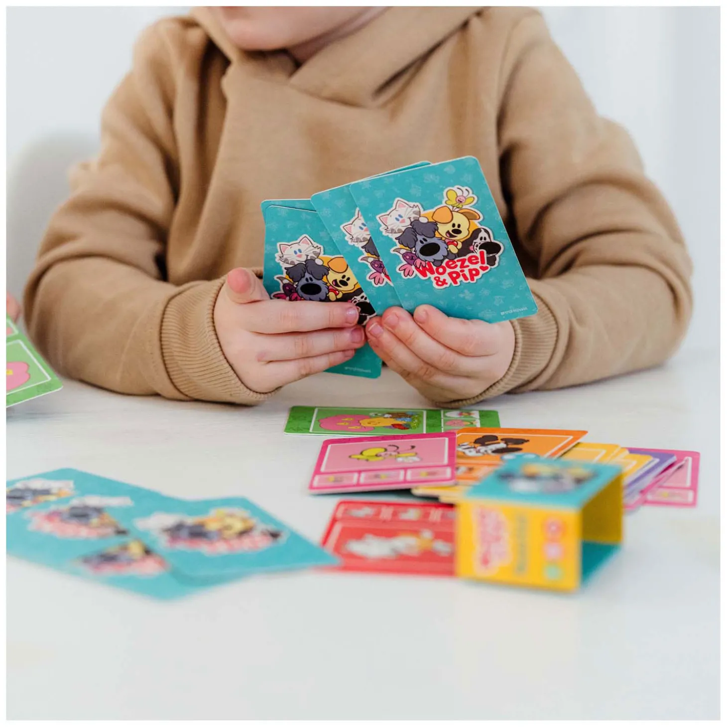Het kwartetspel bestaat uit 32 kartonnen kwartetkaarten in vrolijke kleuren, met daarop duidelijke en leuke illustraties van al je favoriete karakters uit Woezel & Pip. Buurpoes, Molletje, Tante Perenboom… iedereen is van de partij!