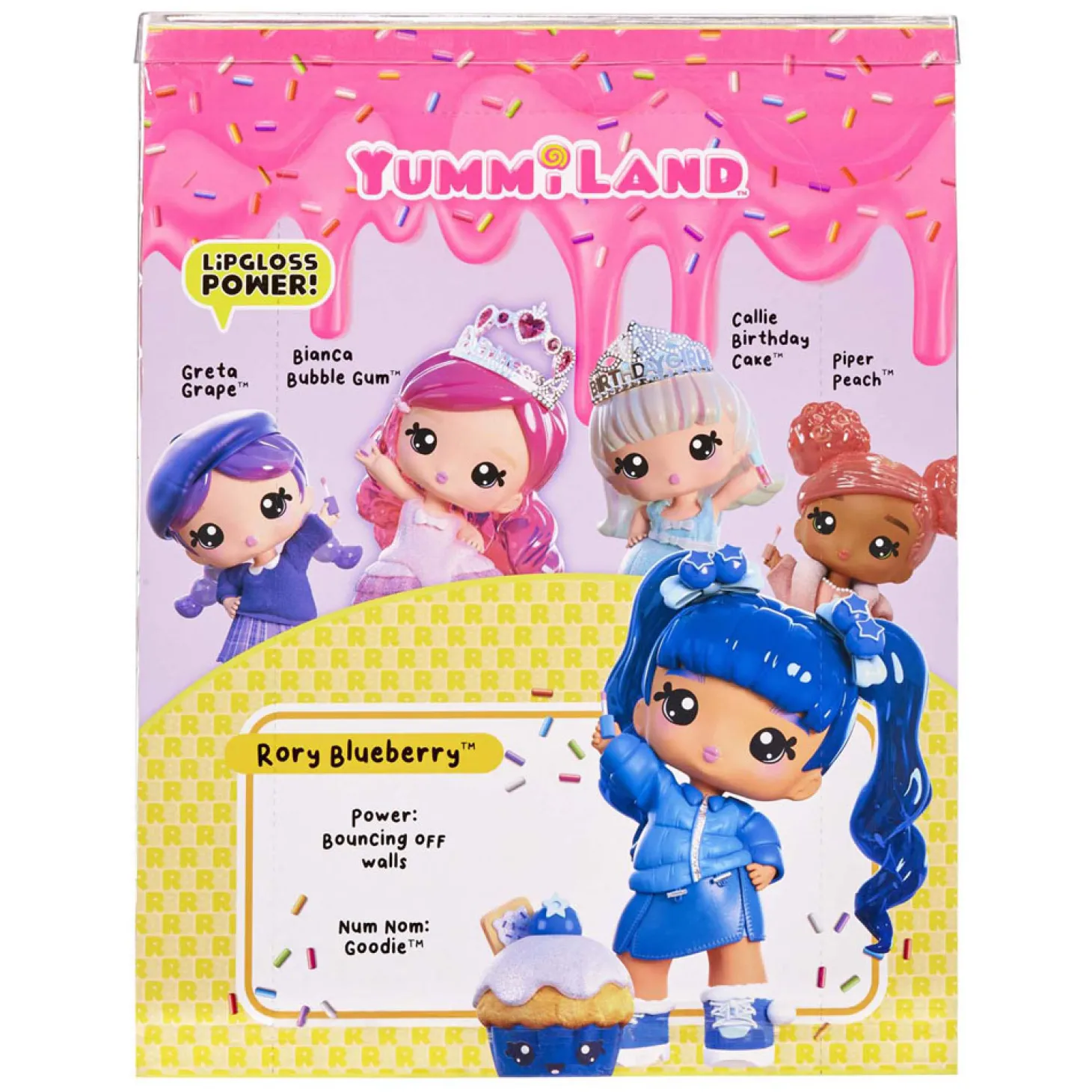Rory Blueberry woont in Yummiland samen met haar vriendinnen die ook van avontuur houden. Haar speciale lipgloss geeft haar een superkracht: ze kan heel hoog en ver springen. Speel thuis mee met je geparfumeerde Rory Blueberry-pop en haar Num Nom Goodie door je eigen lipgloss met bosbessengeur te maken.
