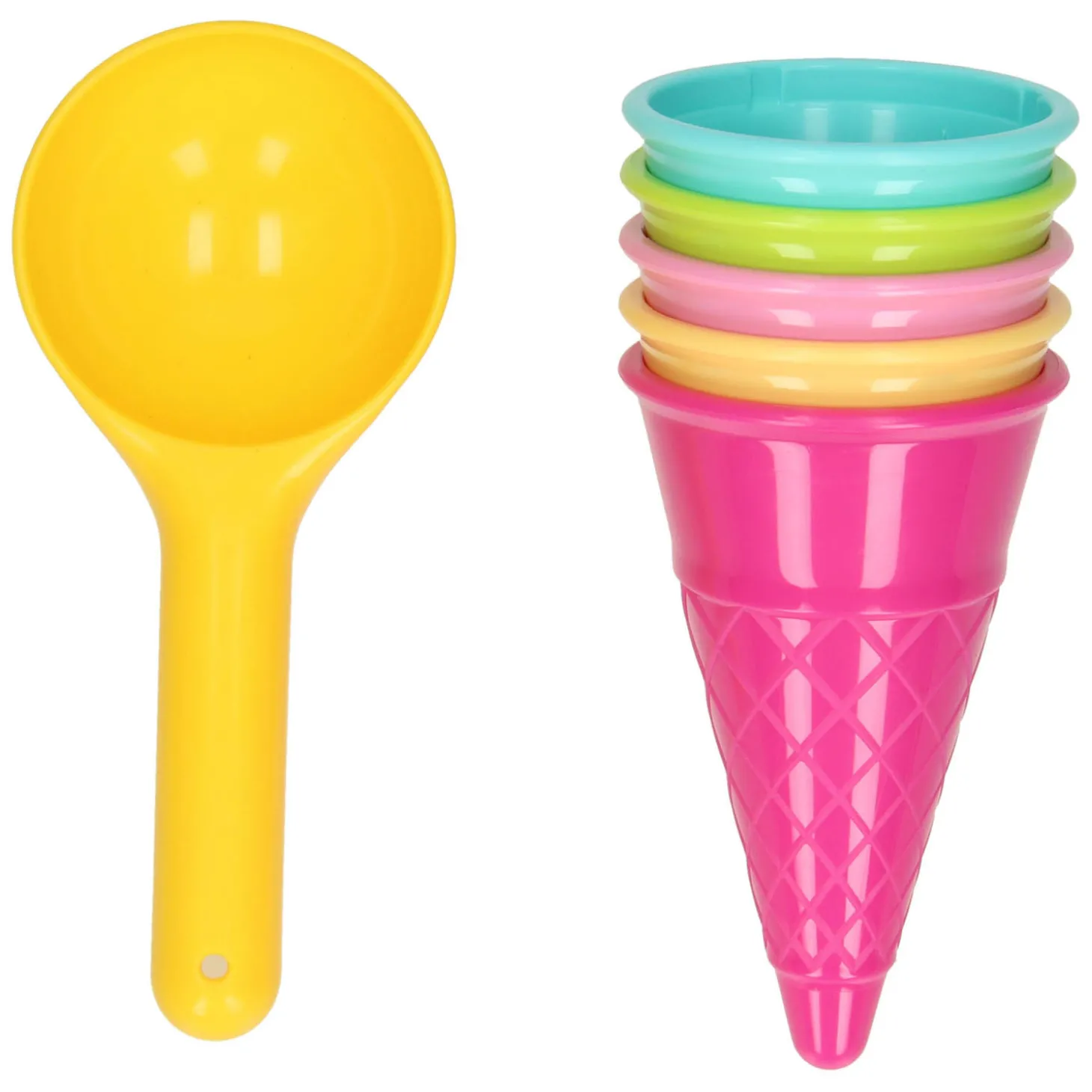 Met deze set maak je de lekkerste zand-ijsjes. De set bestaat uit 5 ijshoorntjes en 1 ijslepel.