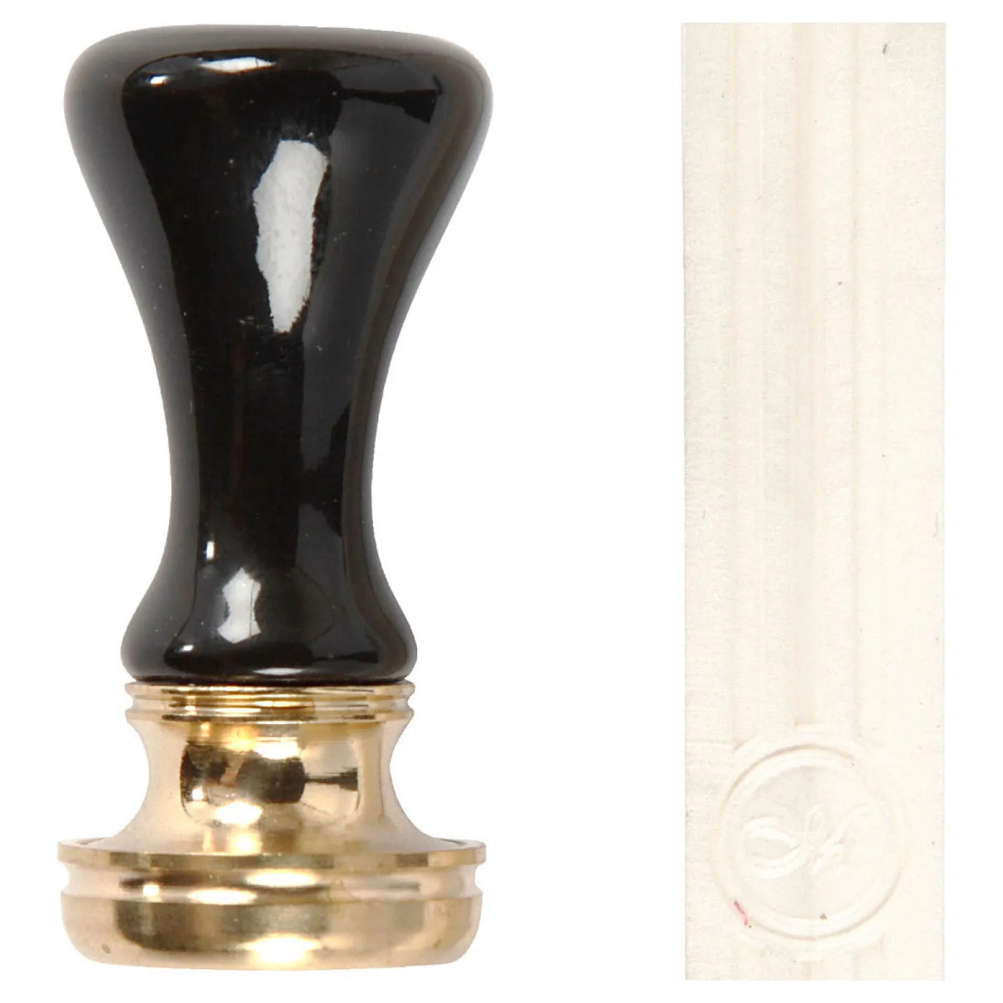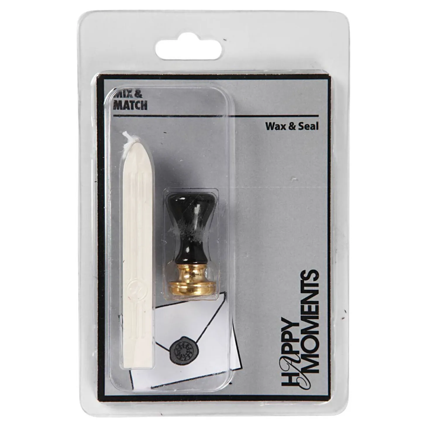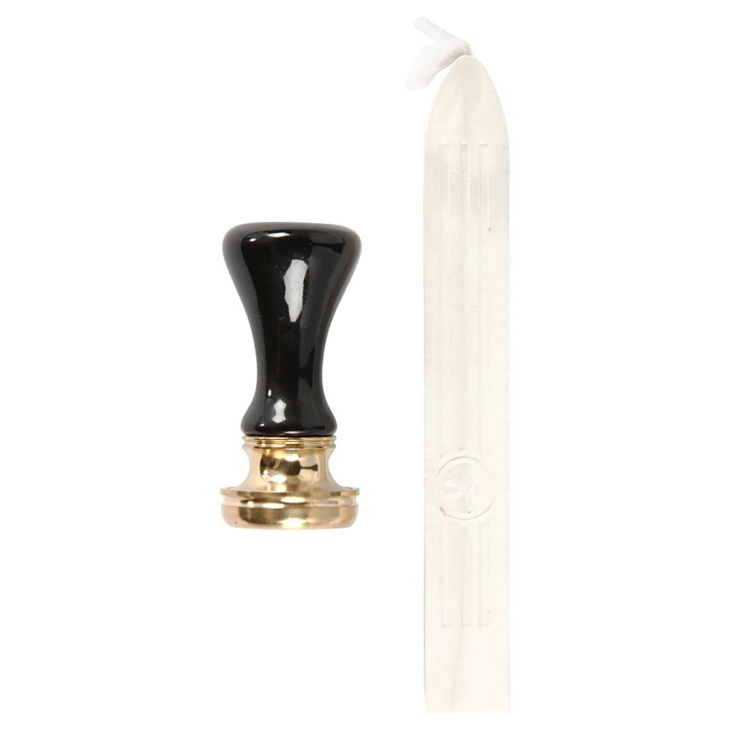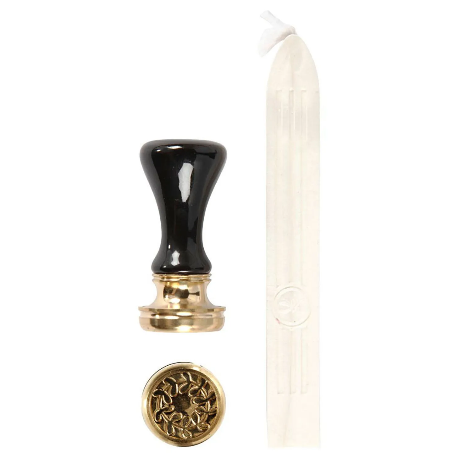 Starterset met rode zegelwas met een lont, handvat en zegel met motief van een lauwerkrans. De zegelwas wordt gesmolten en gedruppeld op de plek die je wilt decoreren. Druk daarna het motief in de warme was. Genoeg voor ca. 10 zegels.