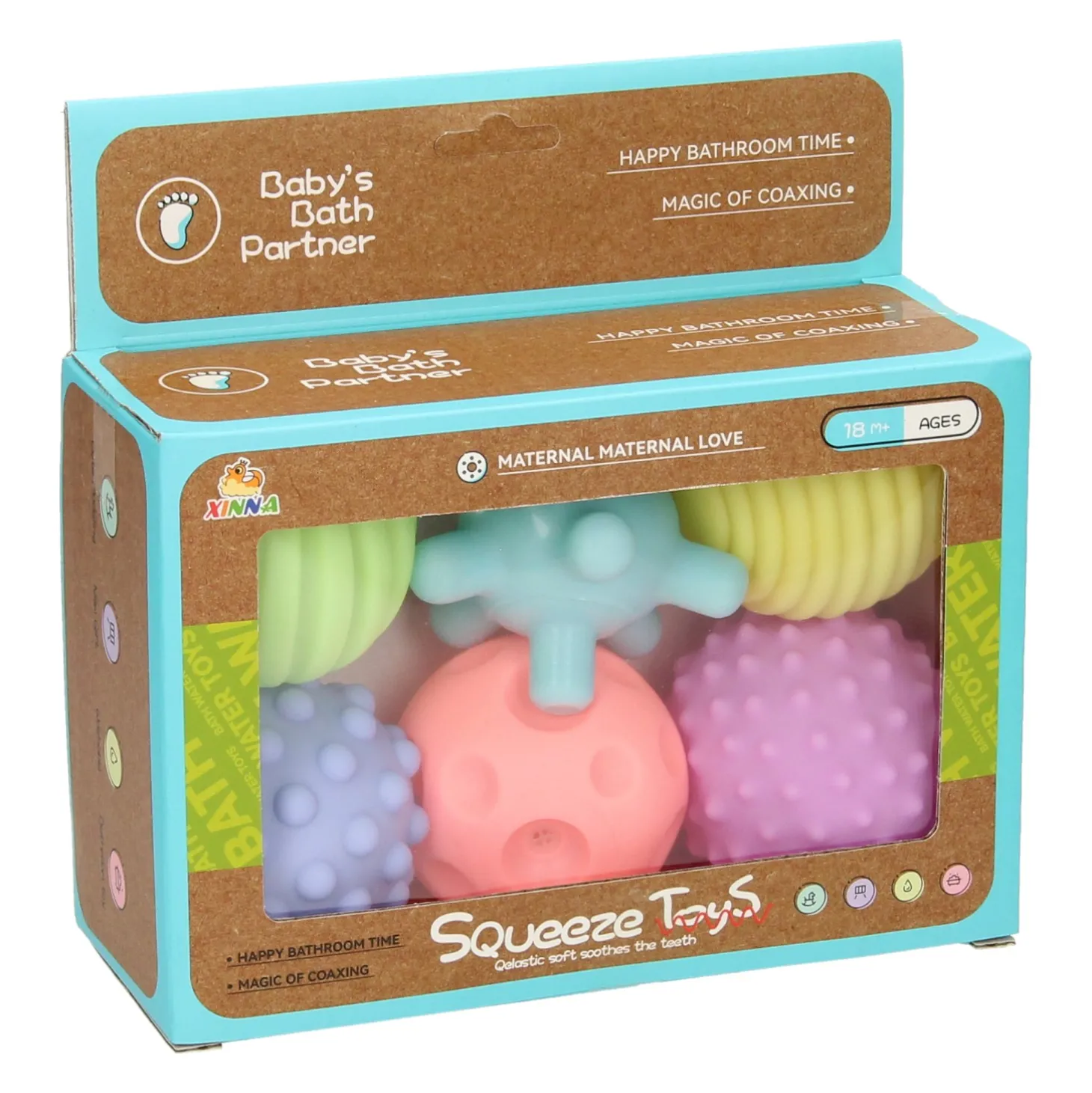 Set van 6 zintuigballen voor dreumesen en peuters vanaf 18 maanden oud. De ballen zijn gemaakt van zacht kunststof en hebben verschillende inkepingen en vormen die de tastzin stimuleren. De ballen zijn ca. 5,5 à 6 centimeter groot. De zintuigballen zijn makkelijk wasbaar en ook geschikt voor in bad.