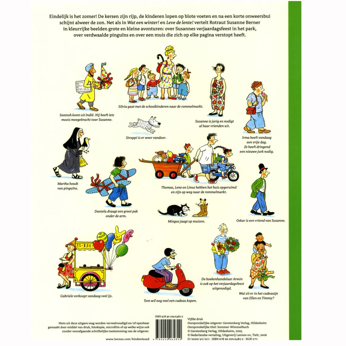Eindelijk is het zomer! De kersen zijn rijp, de kinderen lopen op blote voeten en na een korte onweersbui schijnt alweer de zon. Net als in Wat een winter! en Leve de lente! vertelt Rotraut Susanne Berner in kleurrijke beelden grote en kleine avonturen: over Susannes verjaardagsfeest in het park, over verdwaalde pinguïns en over een muis die zich op elke pagina verstopt heeft. Auteur: Rotraut Susanne Berner. Inhoud: 16 pagina’s. Geschikt vanaf 4 jaar.
