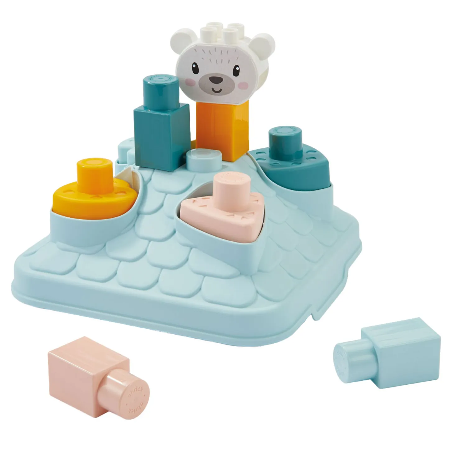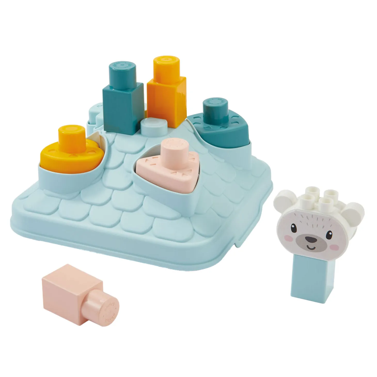 Slim en praktisch: dit huisje bevat 4 vormen, 4 stenen en 1 berenkop. Het huisje dient tegelijk als compacte opbergplek.