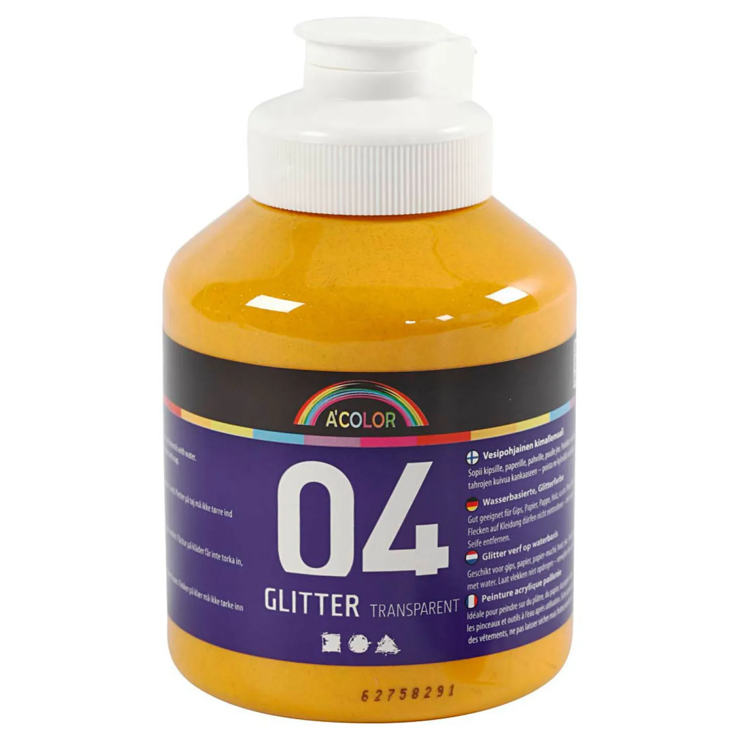 Uitstekende kwaliteit acrylverf op waterbasis. Doorschijnende kleuren met glittereffect. Geschikt als verf en als glittereffect op papier-maché, papier, gips en andere lichte vormen. A-Color kan veilig gebruikt worden door kinderen en volwassenen. Maak penselen na gebruik schoon met handwarm water