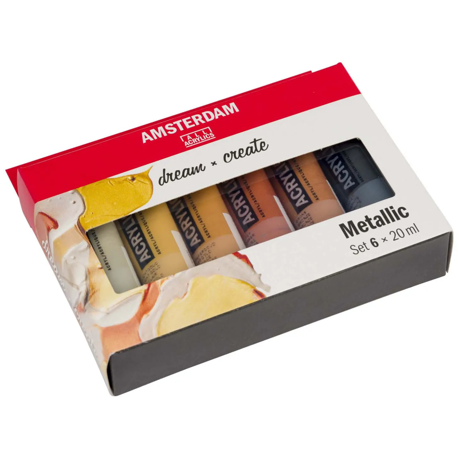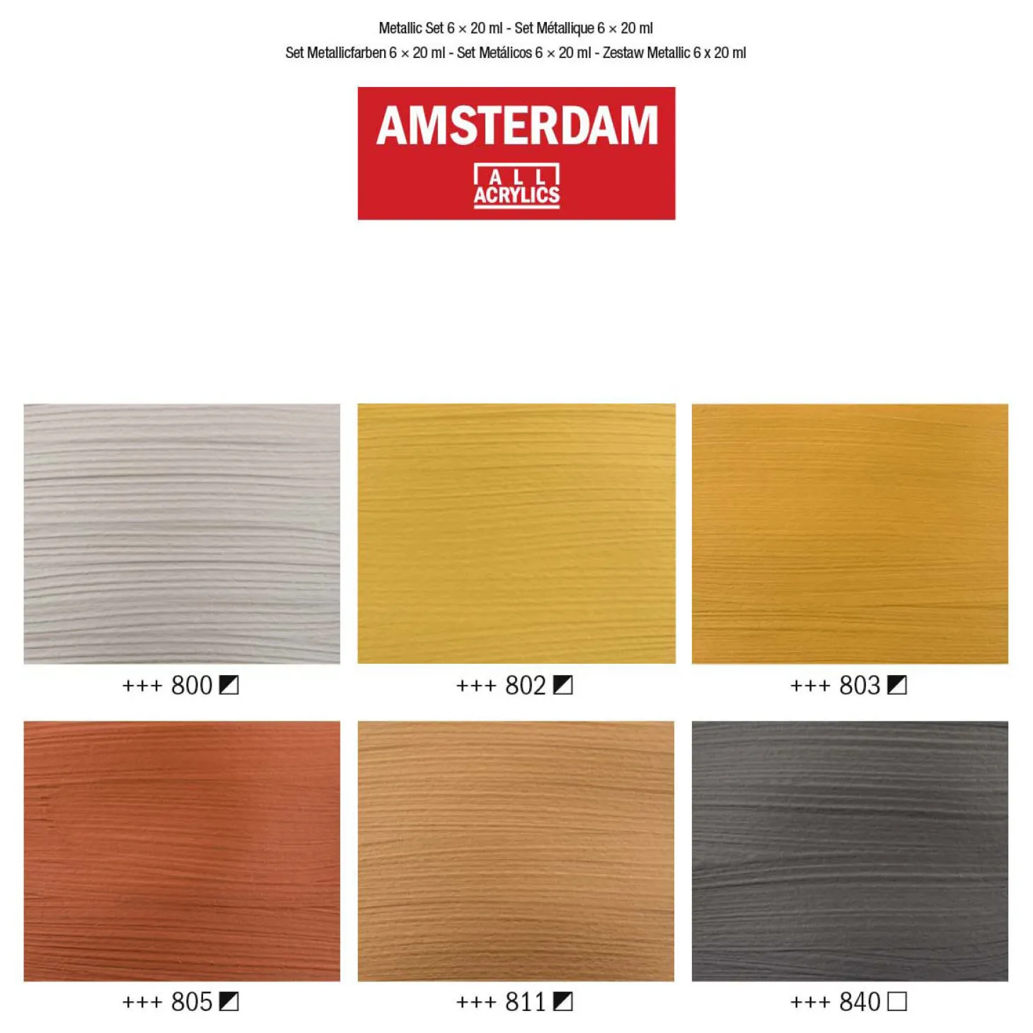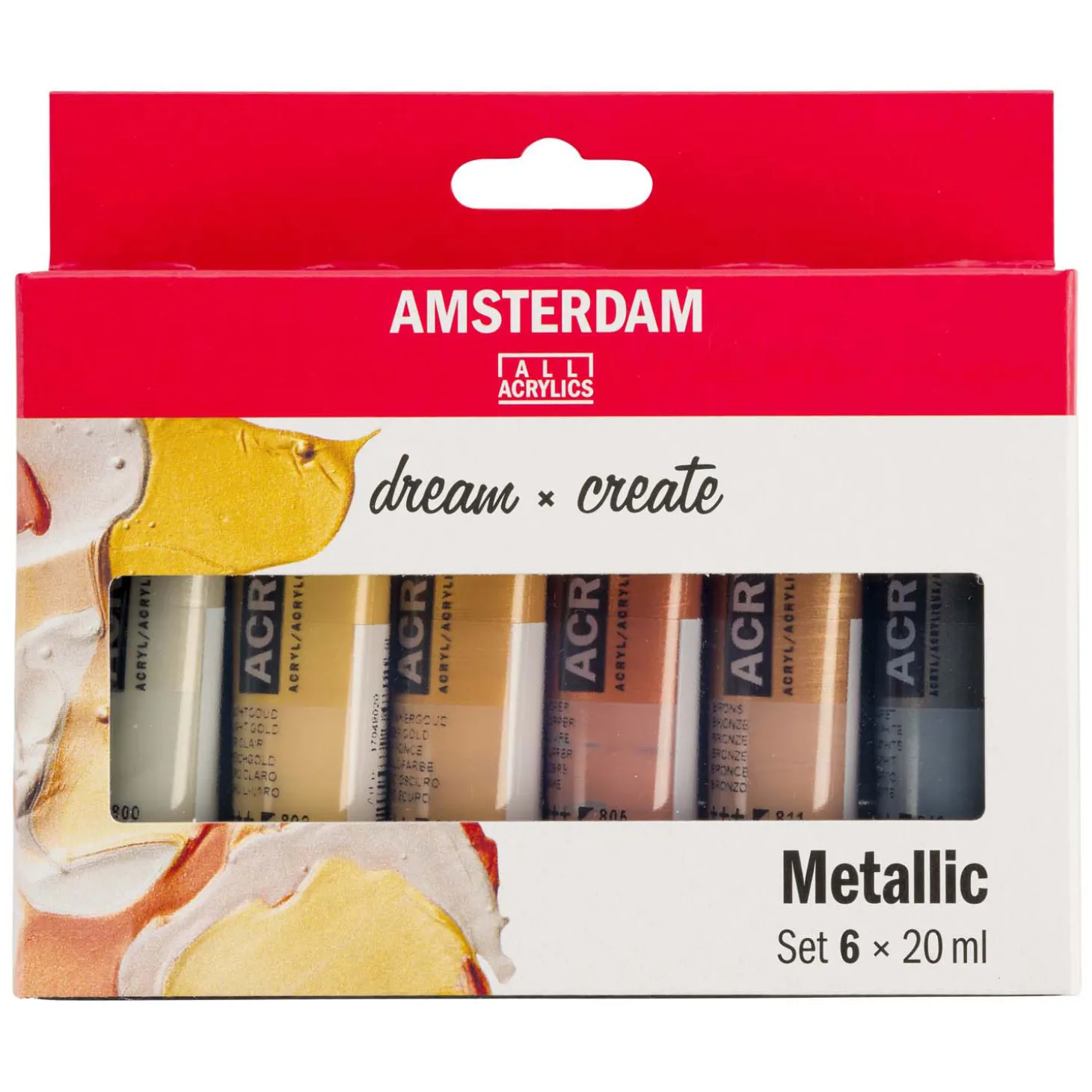Inhoud: 6 x 20 ml tubes (800 Zilver – 802 Lichtgoud – 803 Donkergoud – 805 Koper – 811 Brons – 840 Grafiet).