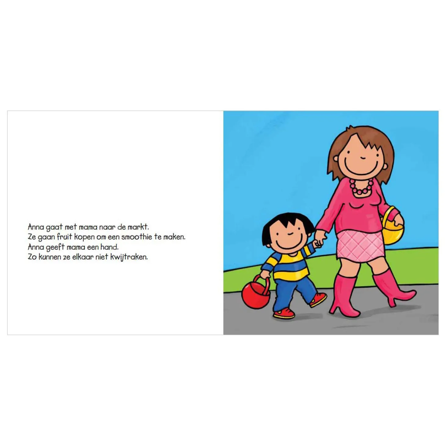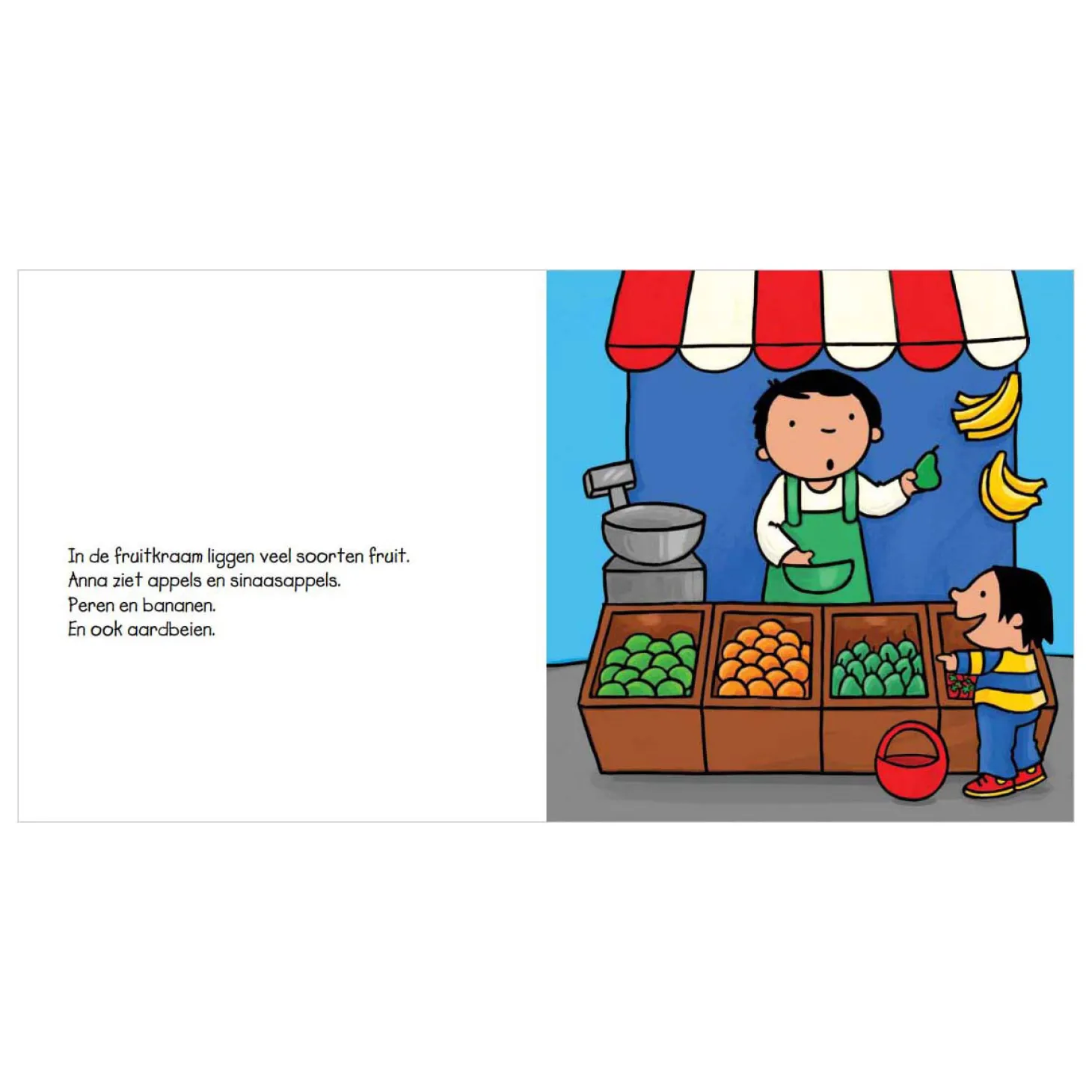Anna gaat met mama naar de markt om fruit te kopen. Anna is dol op fruit en fruitdrankjes. Ze kopen appels, sinaasappels, bananen, aardbeien
