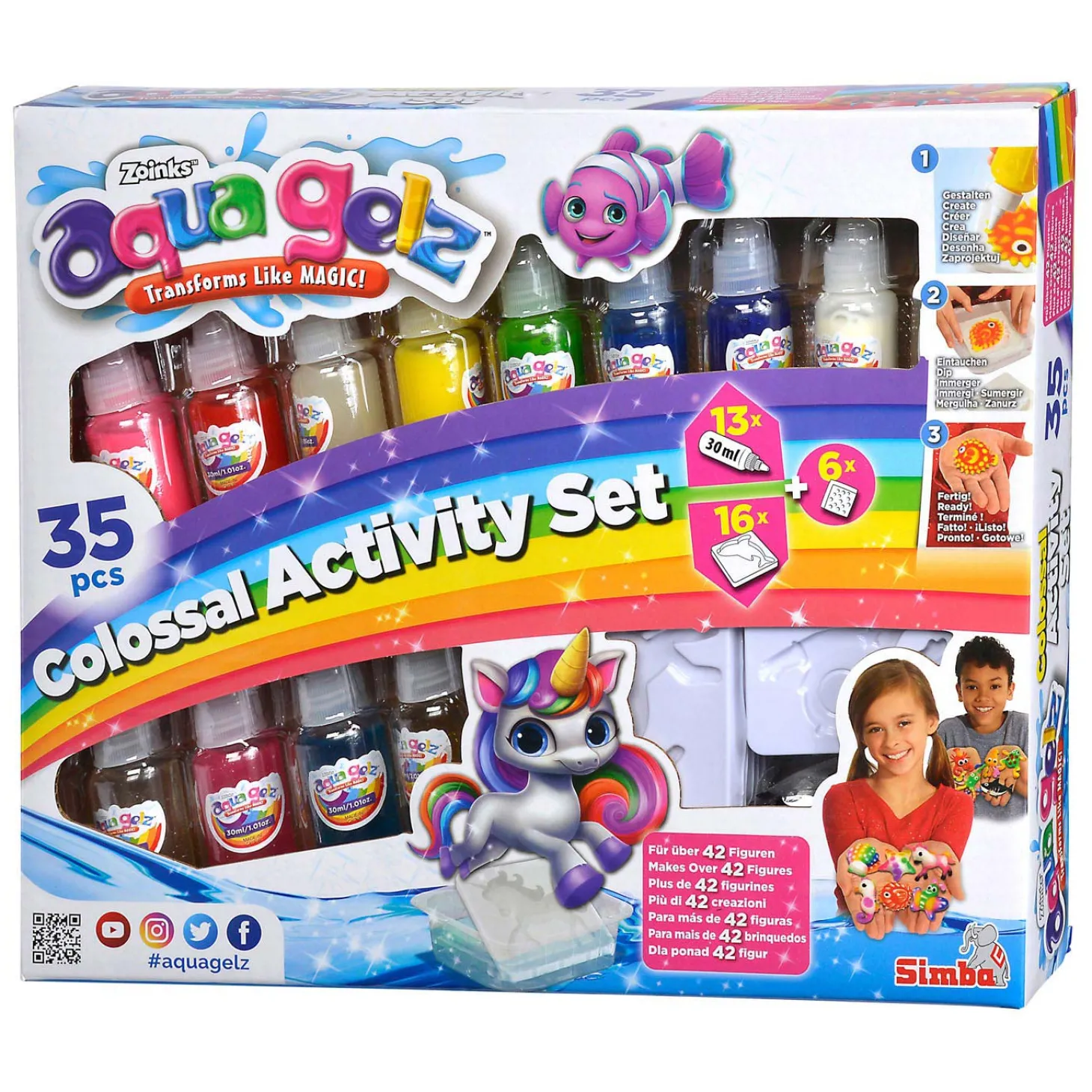 Aqua figuren maak je zelf met een speciale gel. Gebruik een gietvorm naar keuze om te beginnen met je eigen figuurtje. Bij de set zit gelverf die je kunt gebruiken om de gietvorm op te vullen in allerlei kleuren. Maak zo je eigen, creatieve gelpopje. Ben je klaar? Dompel de figuur dan in een bakje water en zie hoe hij vanzelf stevig wordt. Nu kun je het figuurtje uit de vorm halen en gebruiken om mee te spelen of om je kamer mee te versieren. Met een touwtje kun je er een creatieve hanger van maken.