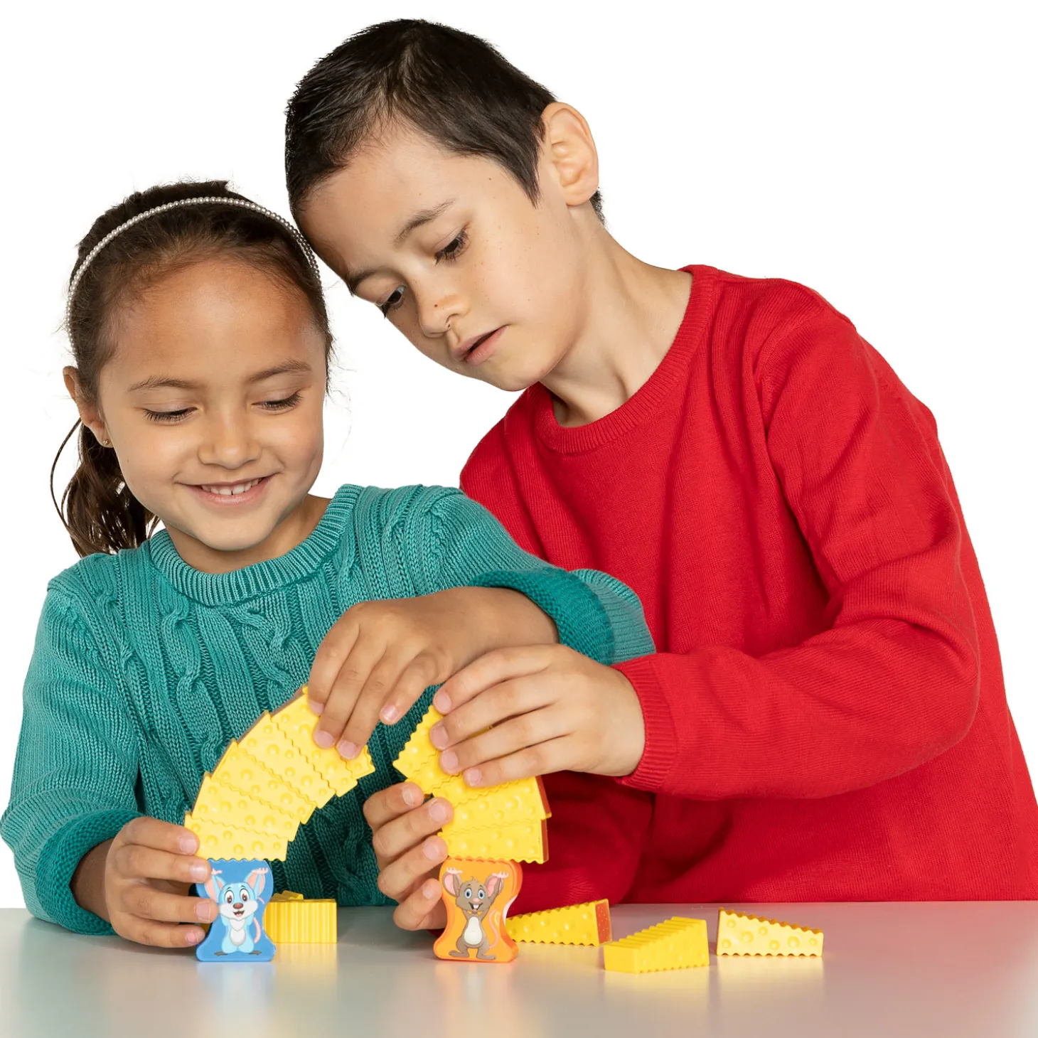 Spel 3: leg de muizen neer, en bouw een boog van kaasstukjes tussen de muizen. Werk samen om de boog overeind te krijgen. Iedereen wint als het lukt zonder dat de boog in elkaar stort!