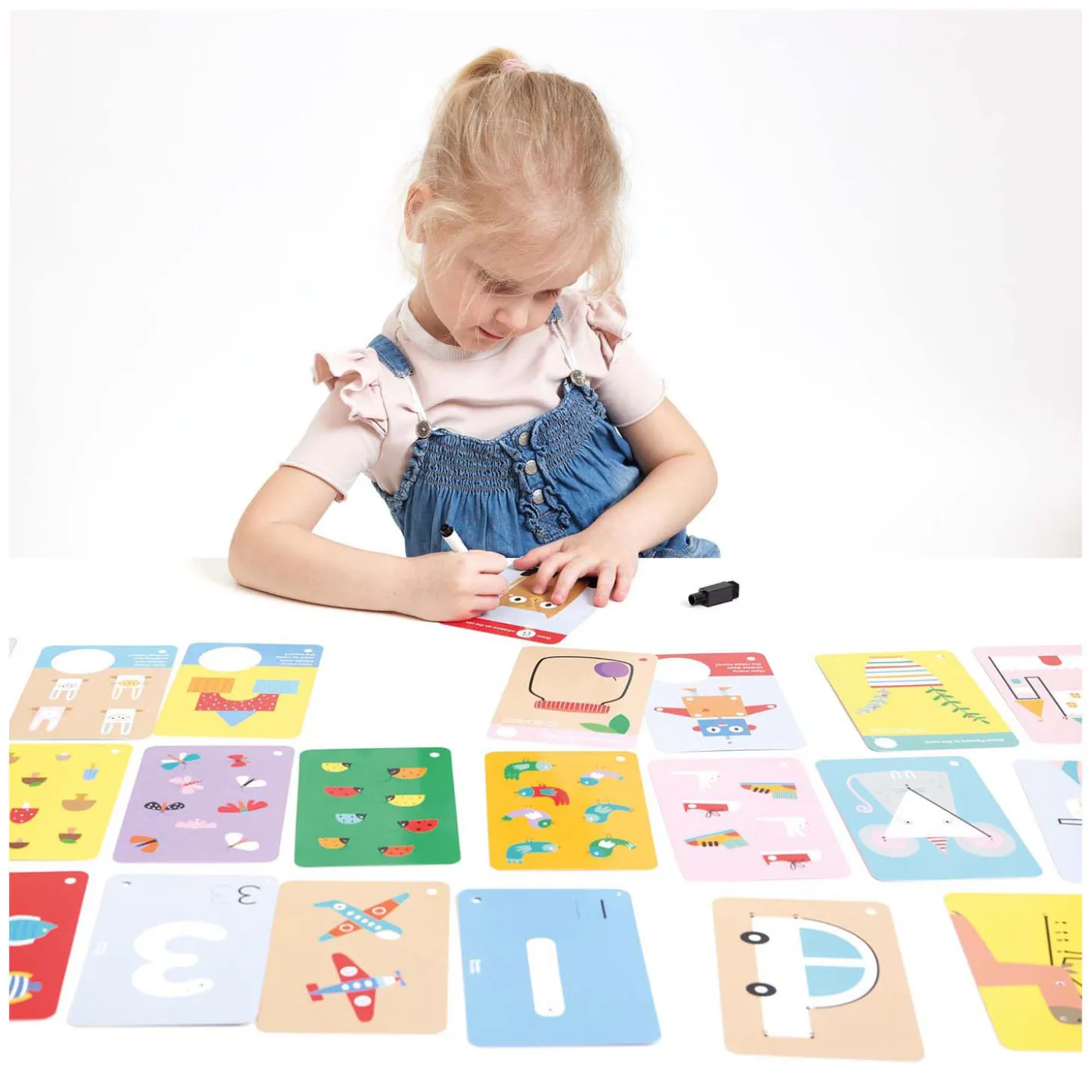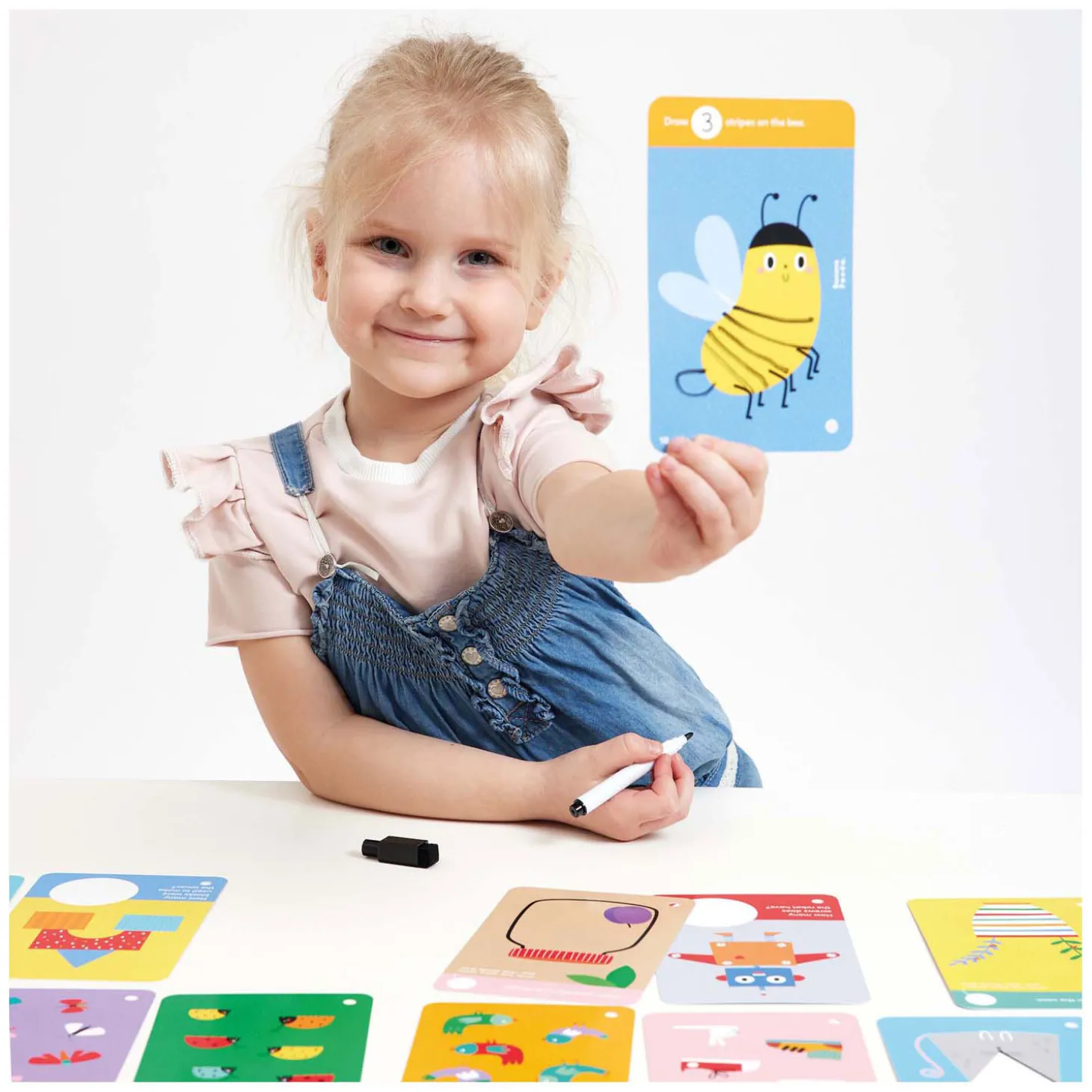 Verschillende activiteiten nodigen kinderen uit tot grafomotorische oefeningen zoals: lijnen overtrekken, stippen verbinden, ontbrekende elementen intekenen of vormen nabootsen. Ze helpen kinderen hun waarnemingsvermogen te ontwikkelen, hun omgevingsbewustzijn te vergroten, hun concentratie te trainen en de juiste schrijfhouding te ontwikkelen. Creatief spelen levert voordelen op voor de toekomst – krabbelen traint de verbeelding en stimuleert de creativiteit, wat een positief effect heeft op het leervermogen en het geheugen. Dankzij het handige formaat met een praktische touwbinding kun je de kaarten overal gebruiken: thuis, op de kleuterschool en onderweg.