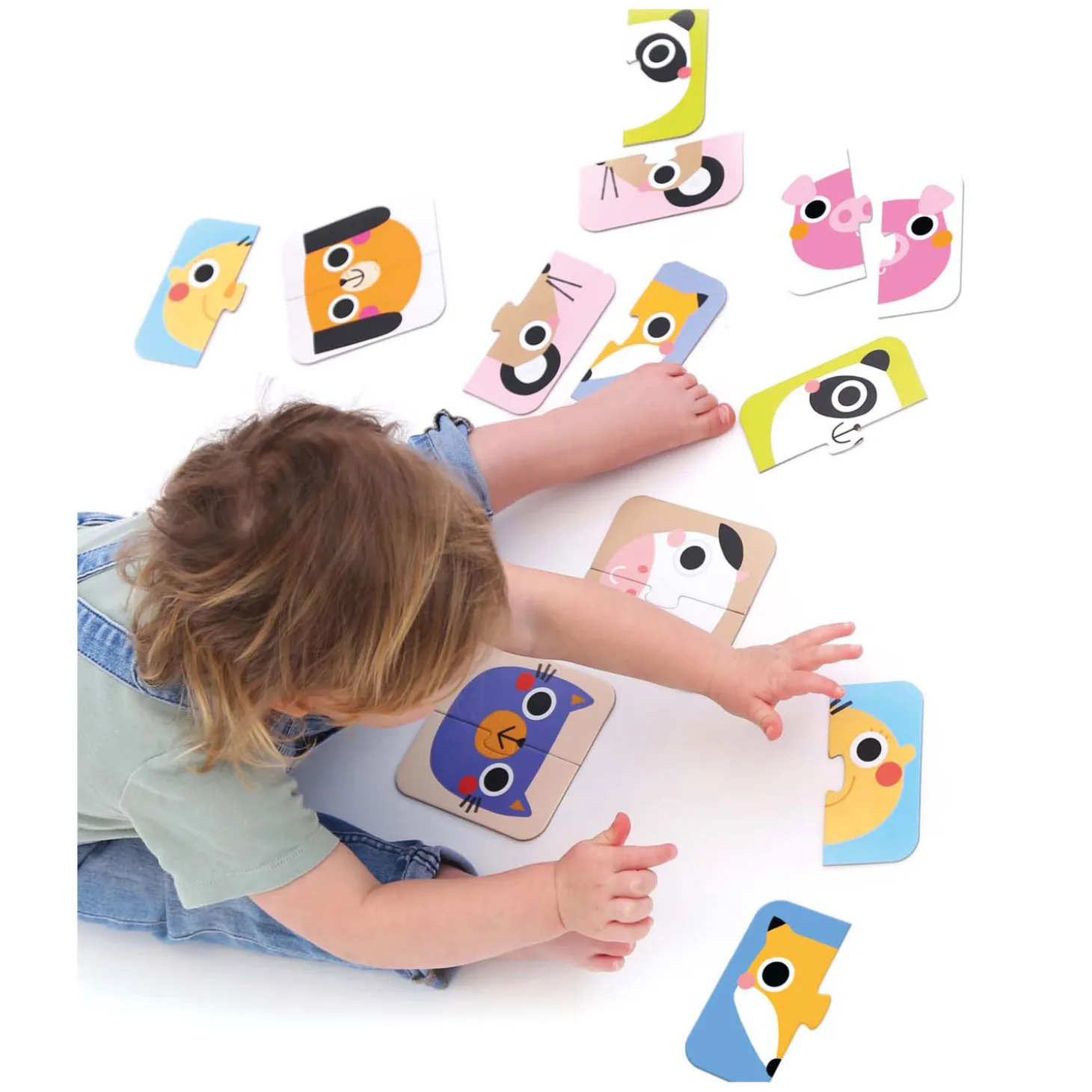 Begin met 2 of 3 puzzelparen en voeg er geleidelijk meer toe. Laat je kind zien hoe de stukjes gecombineerd kunnen worden om smileys te maken. De elementen zijn verwisselbaar, dus ook minder voor de hand liggende combinaties zijn mogelijk. Elke combinatie is een succes!
