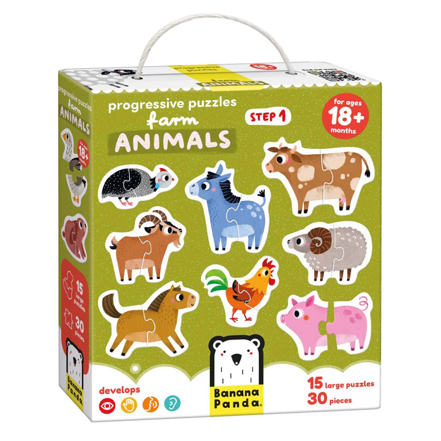 Maak kennis met de boerderijdieren puzzelset, een verzameling van 15 unieke puzzels die je kind eindeloze leeravonturen zullen bezorgen. Ga op reis door de charmante wereld van boerderijdieren terwijl je puzzels van verschillende moeilijkheidsgraden maakt, ontworpen om de puzzelvaardigheden van je kind geleidelijk te verbeteren.