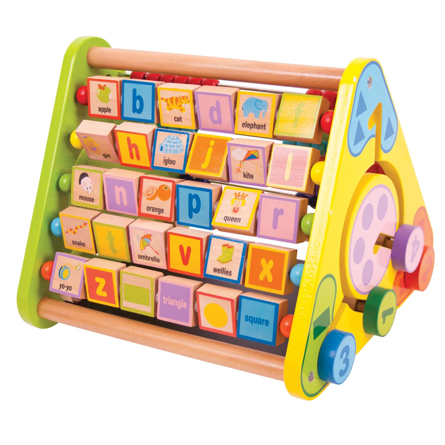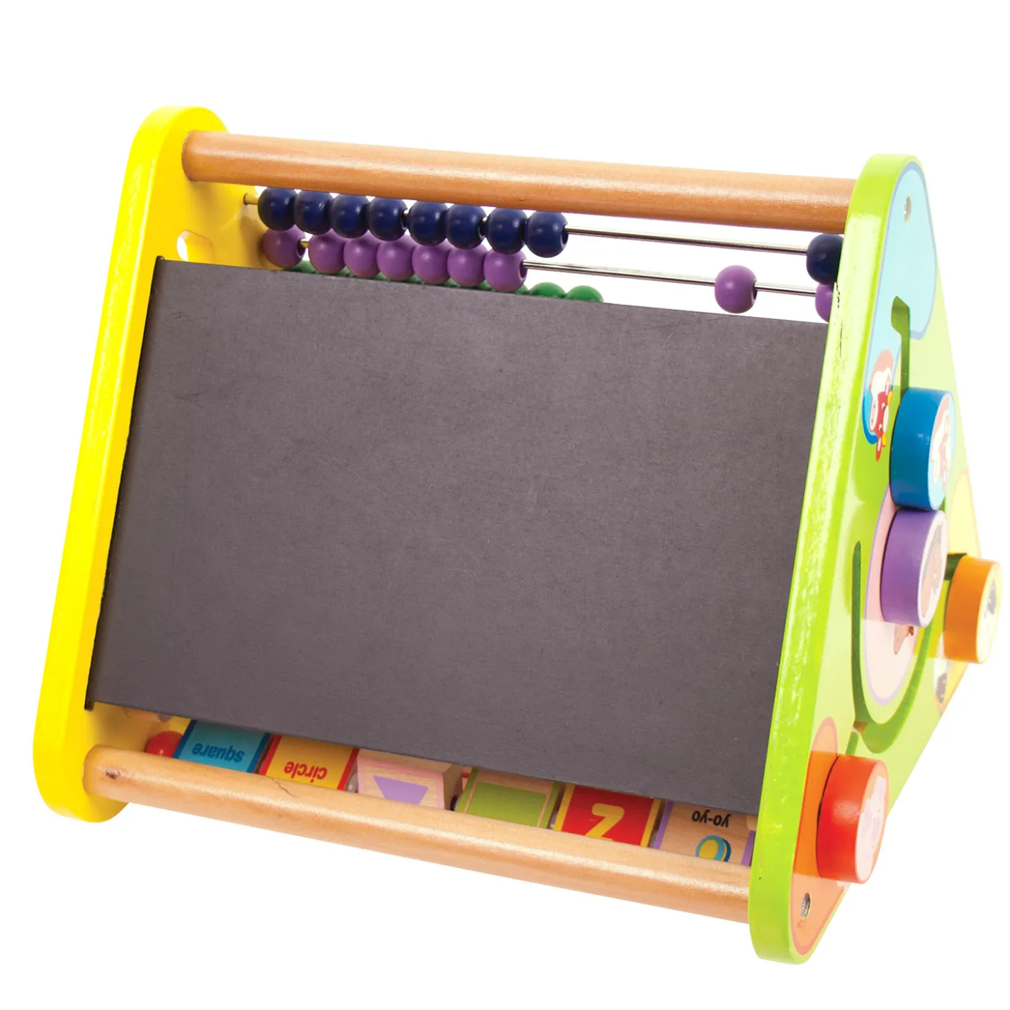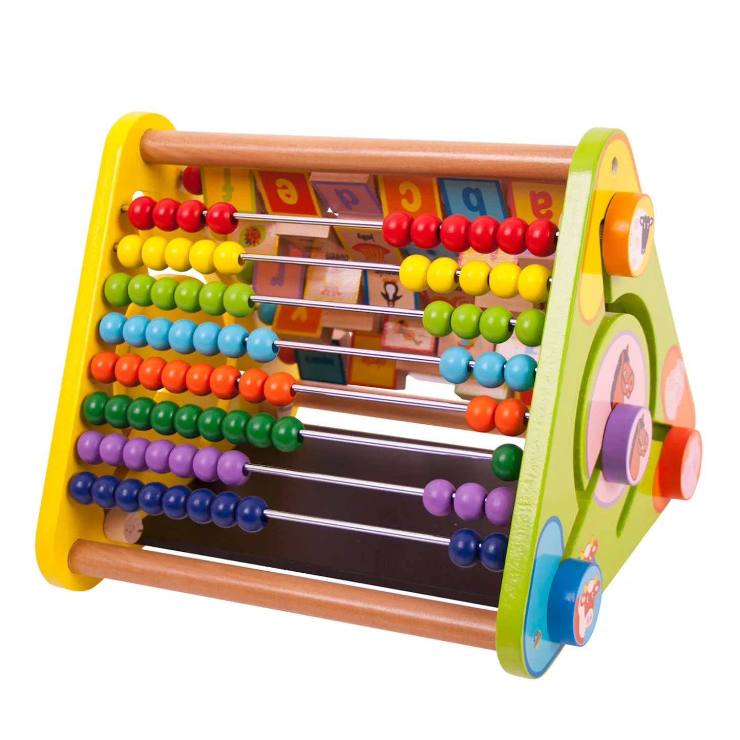 Met de vele vrolijk gekleurde houten onderdelen is er altijd iets leuks te beleven in dit houten activiteiten centrum van BigJigs! Sorteer de vormen, tel de kralen en zoek op een andere zijde de juiste dieren bij elkaar. Laat je creativiteit de vrije loop op het krijtbord of teken de afbeeldingen op de achterzijdes van de letters na. Het activiteiten centrum bevat 5 onderdelen die het leren kennen van de letters, cijfers, kleuren en vormen ondersteunen. Spelen met het activiteiten centrum stimuleert bovendien handigheid en creativiteit.