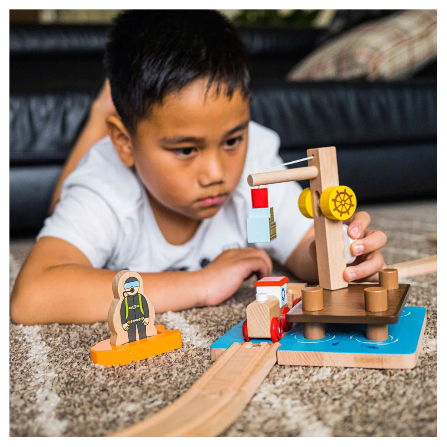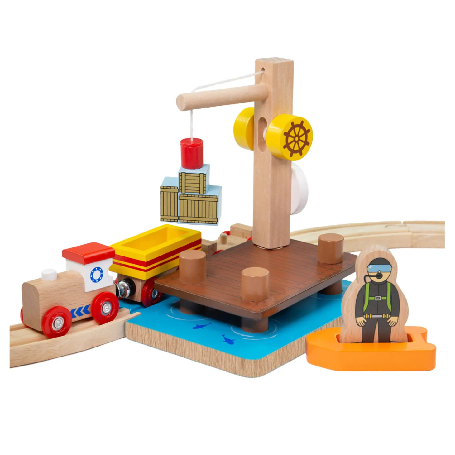 Het duikdock heeft een magnetische katrol die aan de houten laadkisten (niet inbegrepen) wordt bevestigd en ze van de vrachtwagen (afzonderlijk verkrijgbaar) tilt. Helpt bij het stimuleren van de fijne motoriek en creativiteit van kinderen bij het naspelen van verschillende speelscenario’s aan zee.