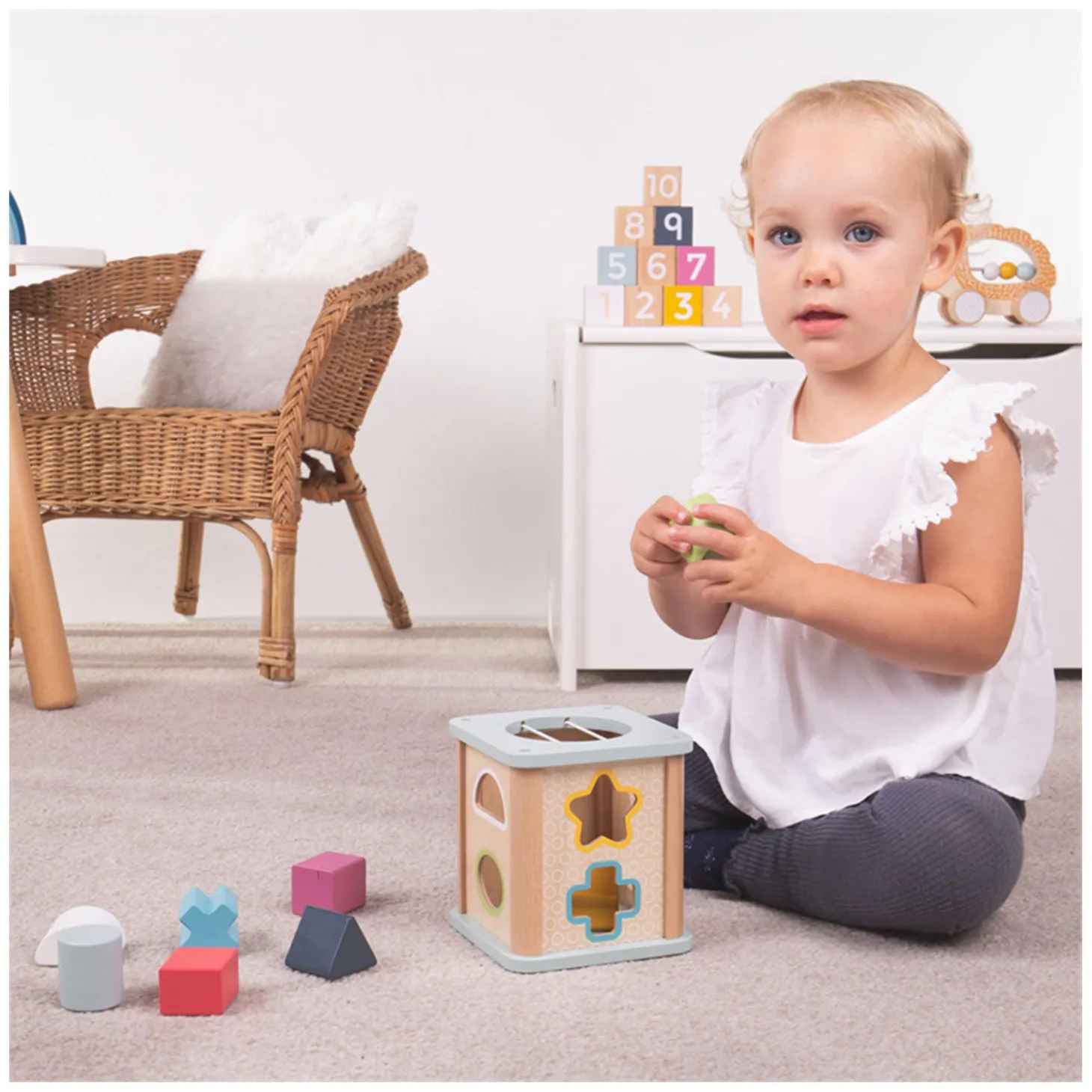 De houten vormensorteerder heeft aan alle zijden uitsparingen zitten voor de houten blokken in vormen zoals een ster, kruis, vierkant en driehoek. Aan de bovenzijde zit een groter gat, dat twee elastieken erdoorheen gespannen heeft. Een goede motoriekoefening voor je kind om zo de blokken uit de vormenstoof te halen!