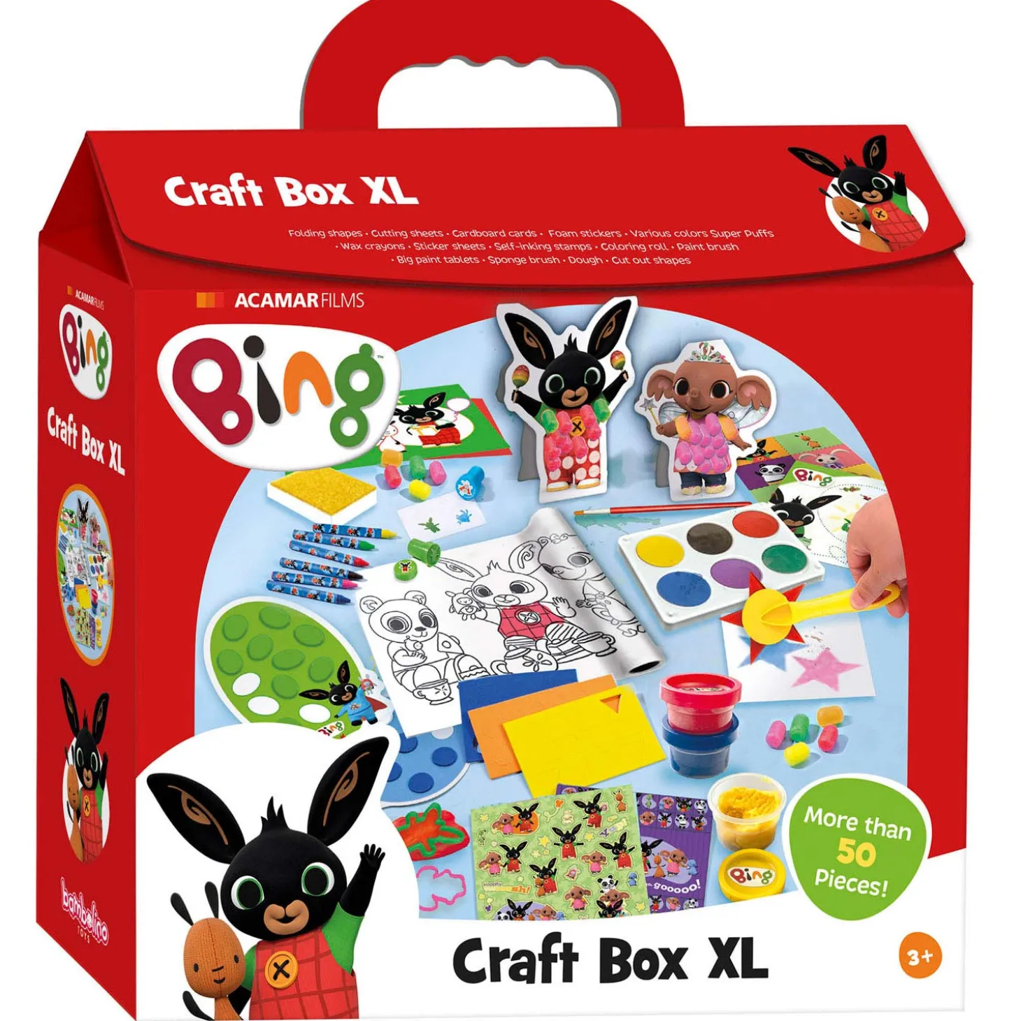 In deze knutselkoffer voor kinderen vind je onder andere neen kleurplaat, waskrijtjes, Bing-figuren met speelmaïs, stickers en klei met vormpjes. Kies jouw favoriete knutselmateriaal of probeer wat nieuws: er is meer dan genoeg keuze!