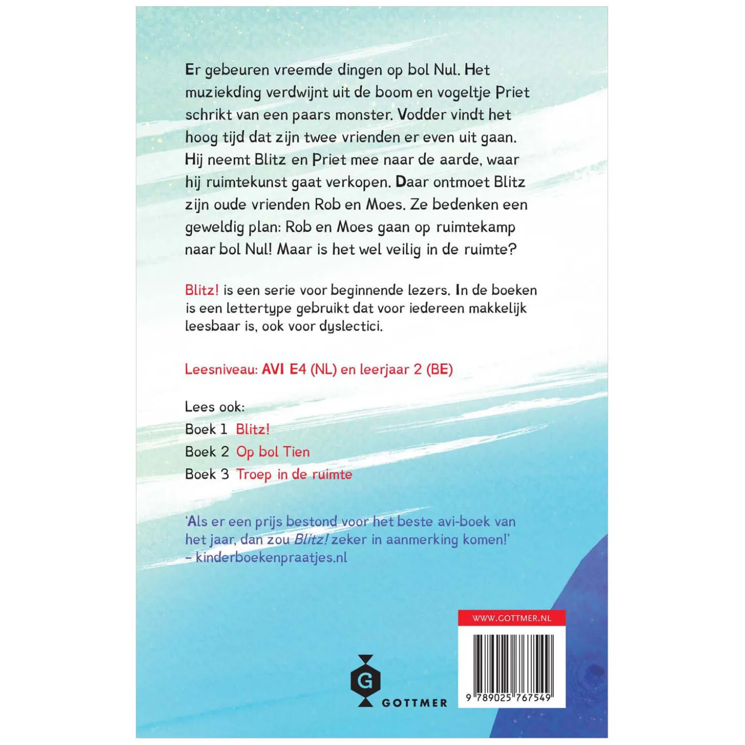 Ruimtewezen Blitz en zijn vogeltje Priet brengen weer eens een bezoek aan de aarde. Daar ontmoeten ze hun oude vrienden Rob en Moes, die weleens een keertje mee willen naar bol Nul. Rob bedenkt gauw een plannetje: waarom gaan ze niet bij Blitz op ruimtekamp? Blitz vindt het prima en dus gaan de jongens mee de ruimte in. Maar daar is het niet veilig. Een paars monster valt de bolbewoners lastig. Hoe moeten ze daar nou weer van afkomen?