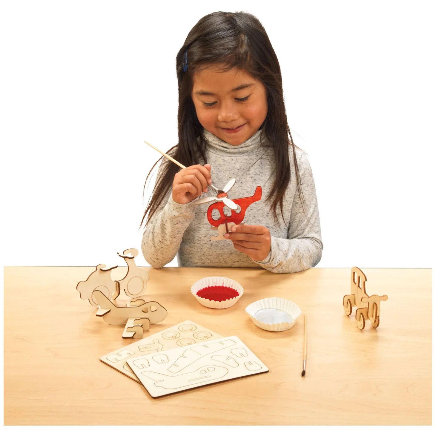 • MAKEN EN VERSIEREN: Gebruik verf, kleurpotloden of stiften om kleurrijke details toe te voegen aan vier verschillende voertuigen die wachten om de weg of de luchtwegen op te gaan!