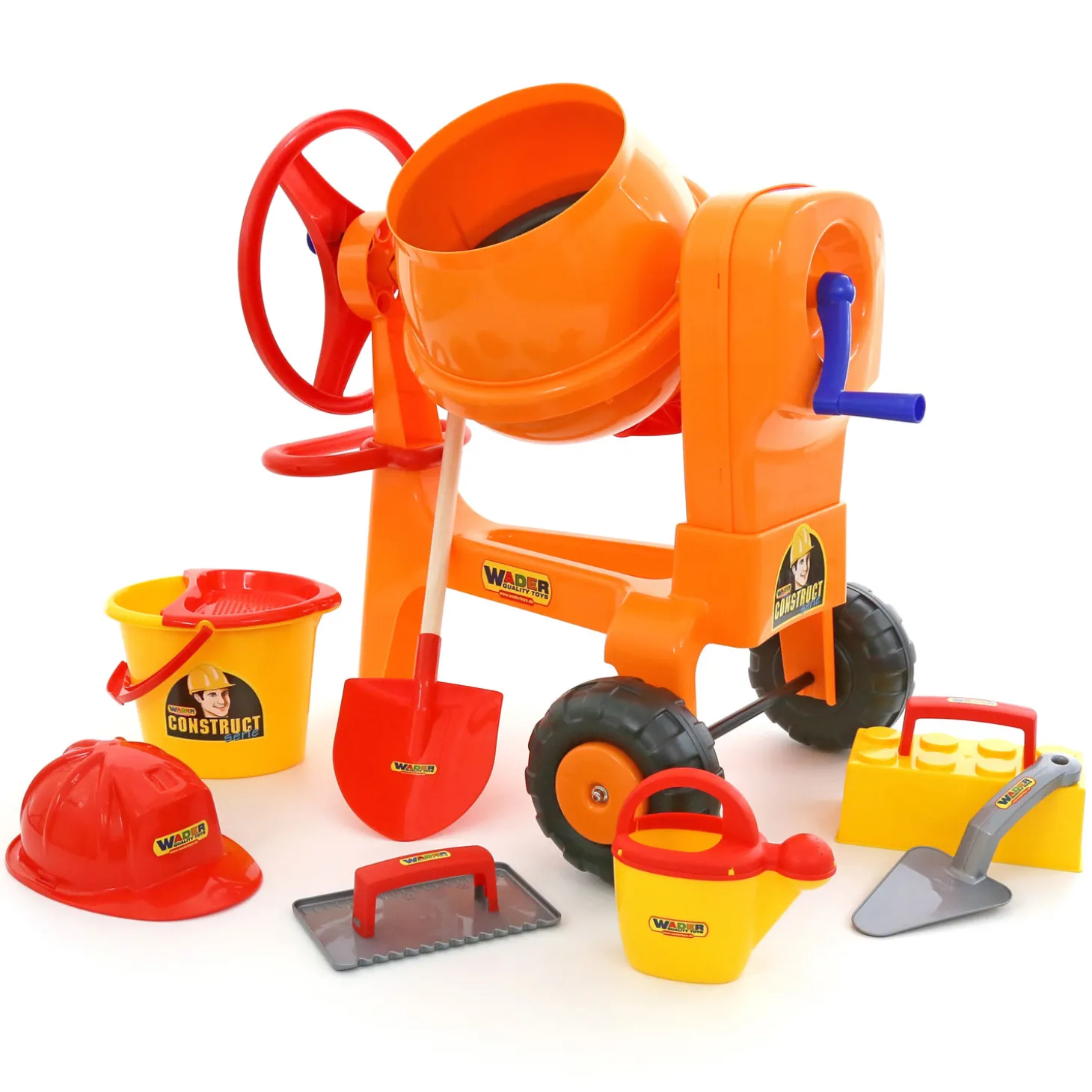 Maak echt cement op de bouwplaats met deze betonmolen met accessoires van Cavallino. Zet de veiligheidshelm op en draai aan het wiel op de zijkant om de betonmolen te laten mixen. Met de hendel aan de andere zijde draai je de bak naar beneden om het cement te lozen. Met behulp van de schep, de emmer, de gieter en de andere accessoires maak je er een stevig bouwwerk van! De cementmolen is gemaakt van stevig kunststof in realistische kleuren. Op de wielen neem je de cementmolen gemakkelijk mee naar de volgende klus! De set bestaat uit een betonmolen met 9 accessoires.