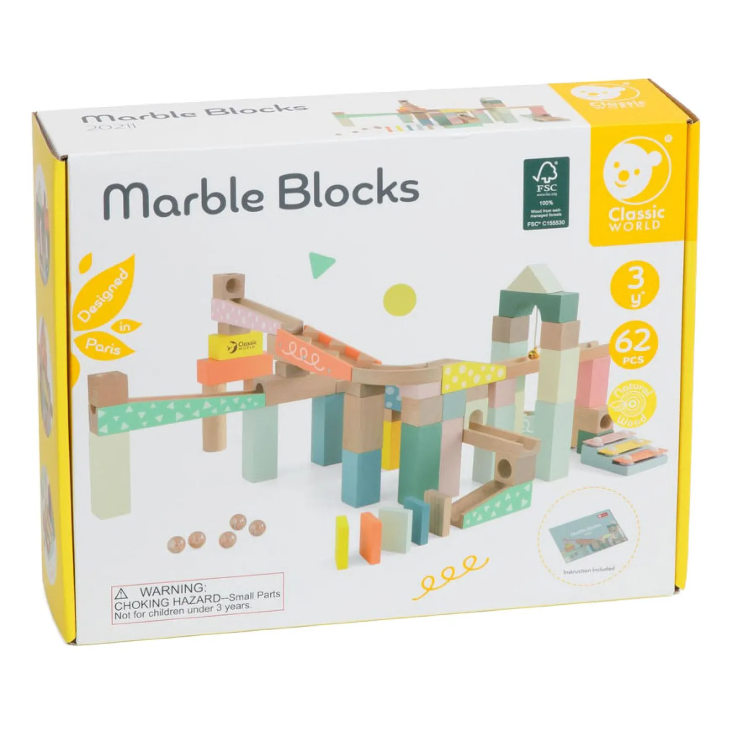 De blokken stimuleren het creatieve denkvermogen, concentratie en de hand-oog-coördinatie. De doos bevat 62 items, inclusief knikkers. De set is geschikt voor kinderen vanaf 3 jaar.