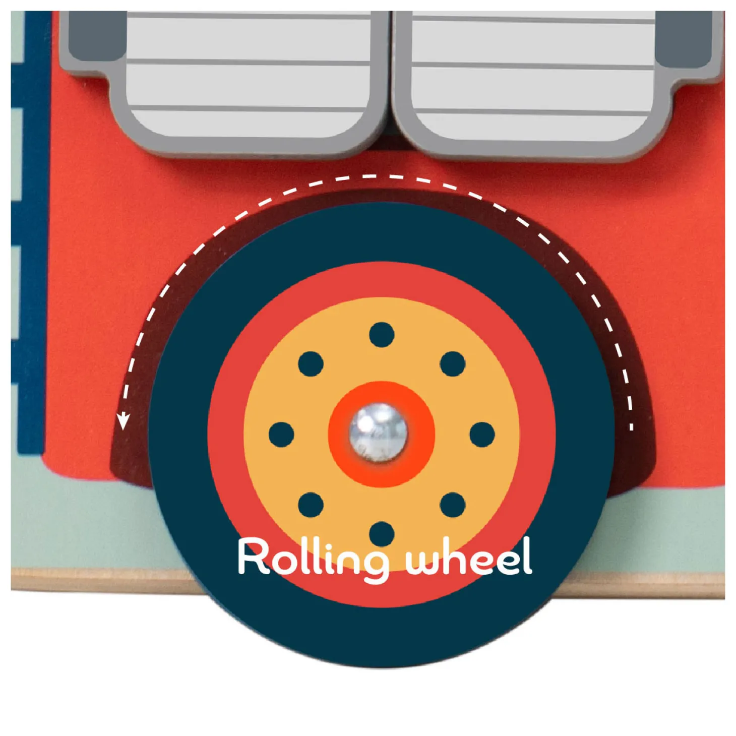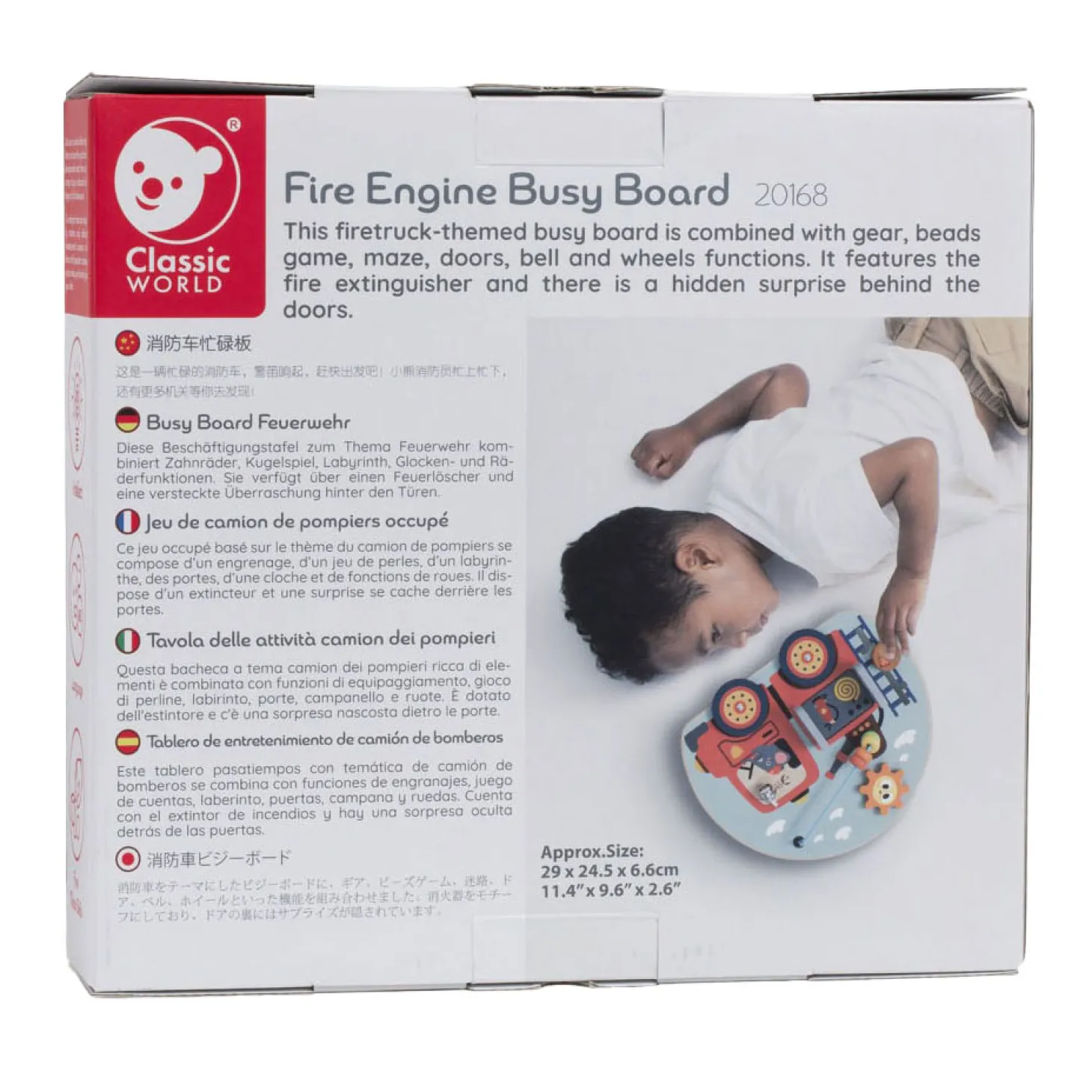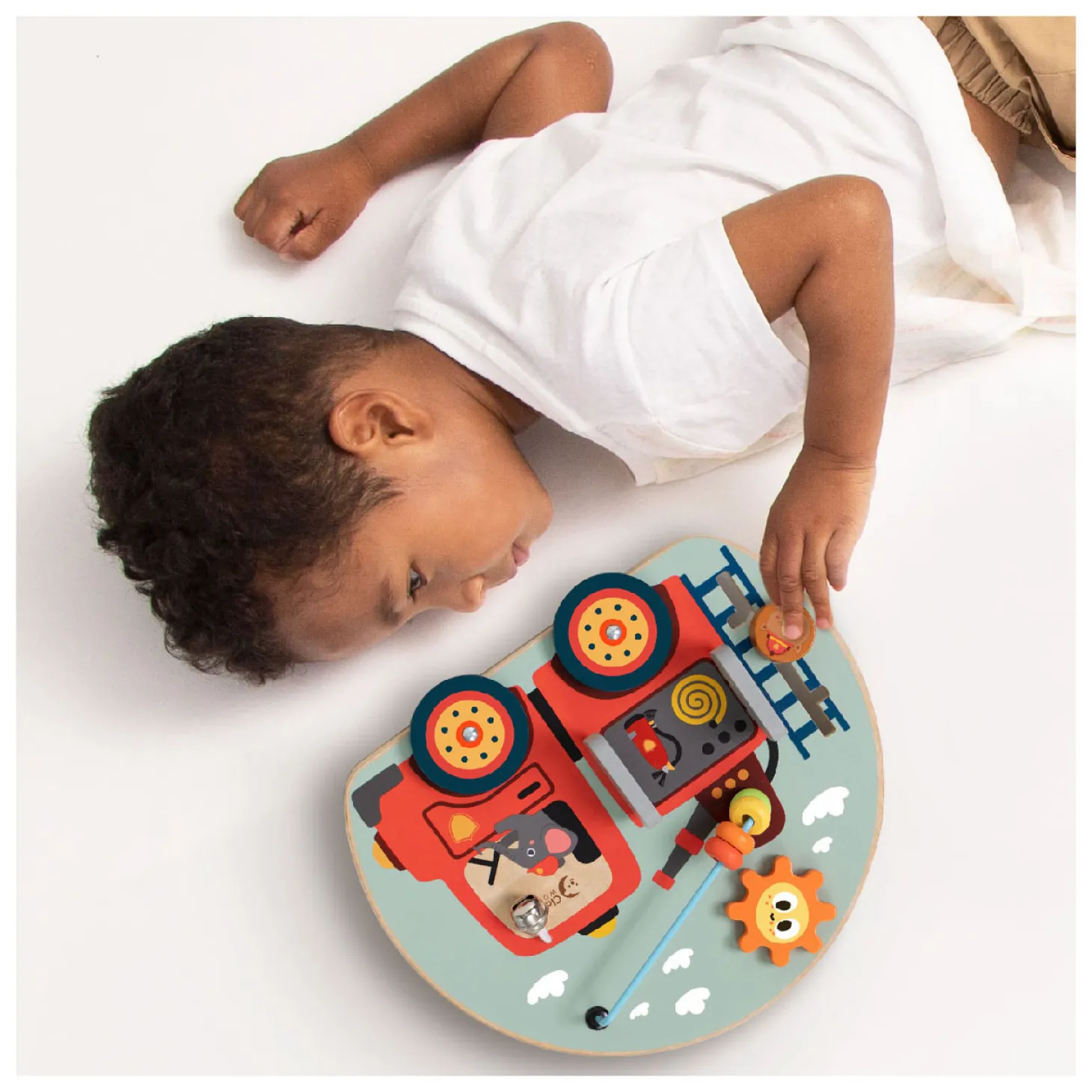 Dit drukke bord met brandweerwagenthema is gecombineerd met uitrusting, kralenspel, doolhof, deuren, bel en wielen. Het bevat de brandblusser en slang als een verborgen verrassing achter de deuren.