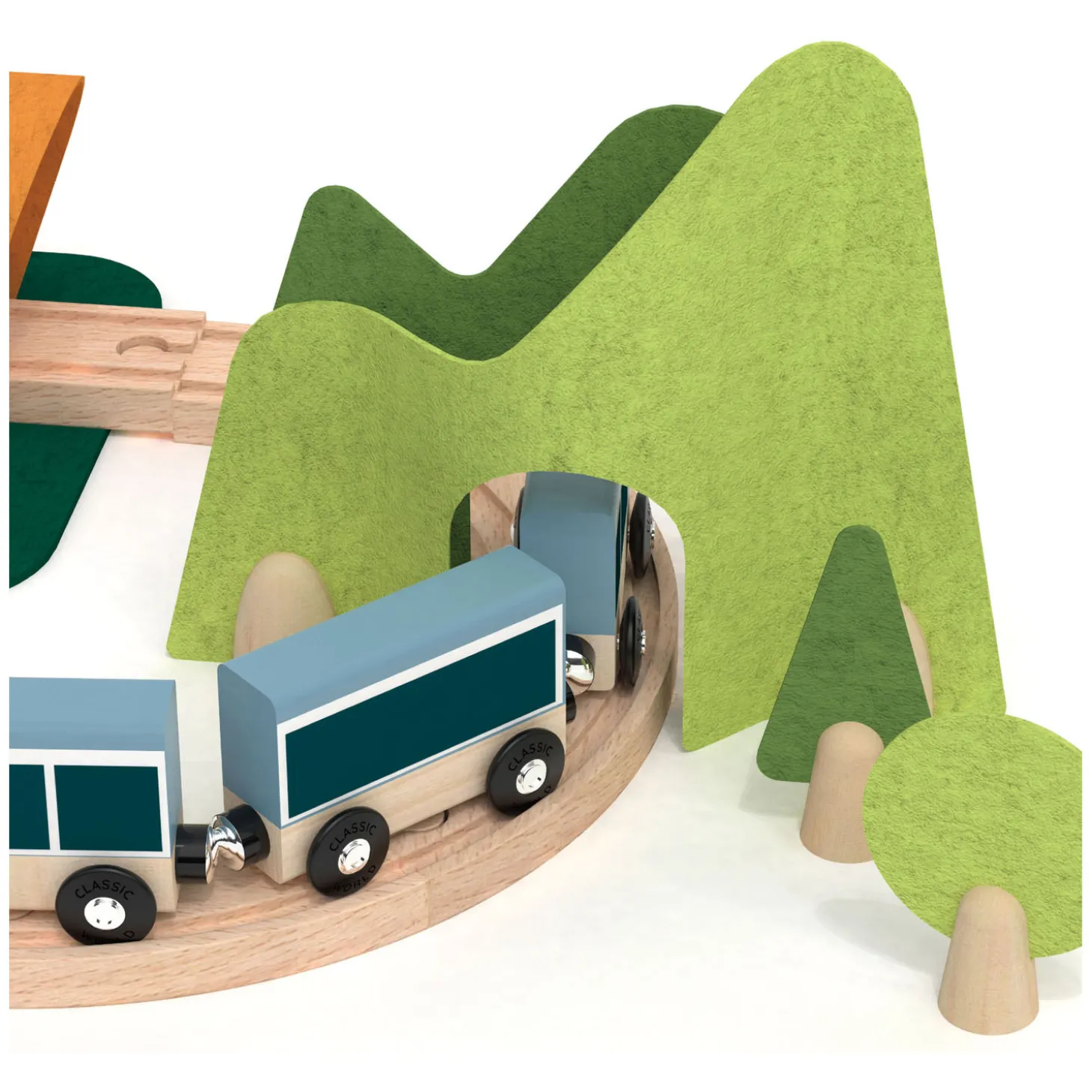 De kleuren van de bloemen en de kleine dieren die zich verstoppen, helpen om de juiste vormen te vinden. Een bel rinkelt wanneer de trein aankomt op het station. Ten slotte kunnen massief houten blokken worden gestapeld om huizen in verschillende vormen te vormen, die rond het spoor kunnen worden gerangschikt, evenals viltbomen om de verbeelding aan te spreken. Deze kleine trein stimuleert fantasierijke activiteiten die creativiteit en taal ontwikkelen, evenals fijne motoriek en coördinatie.