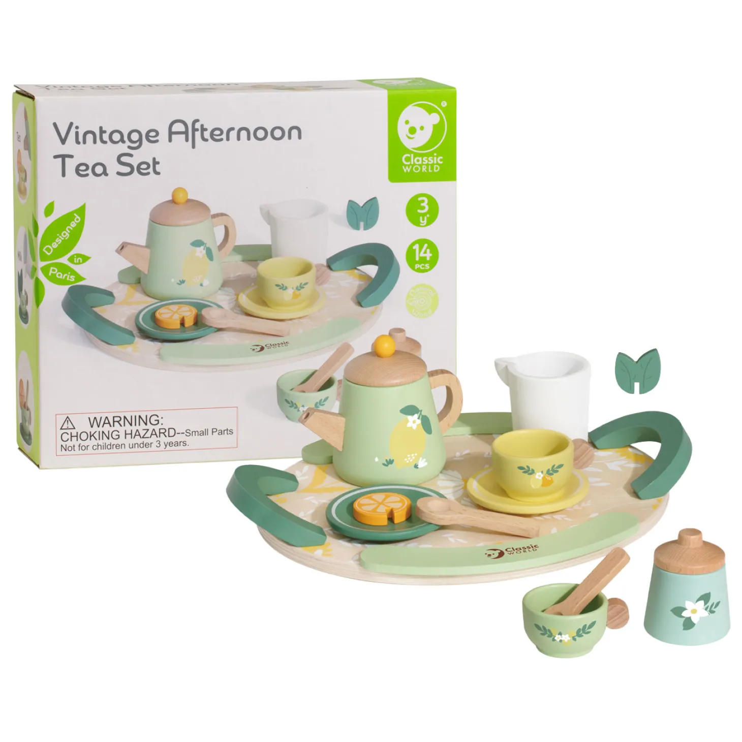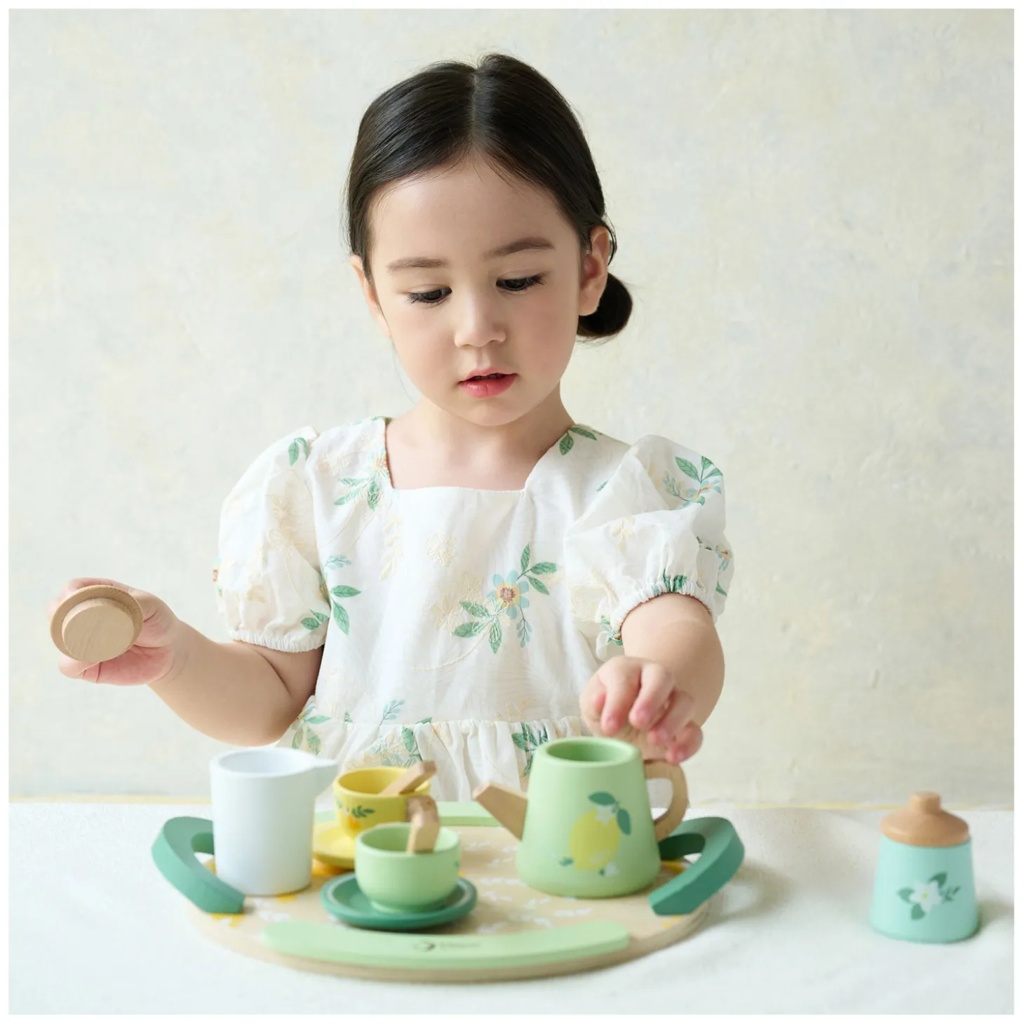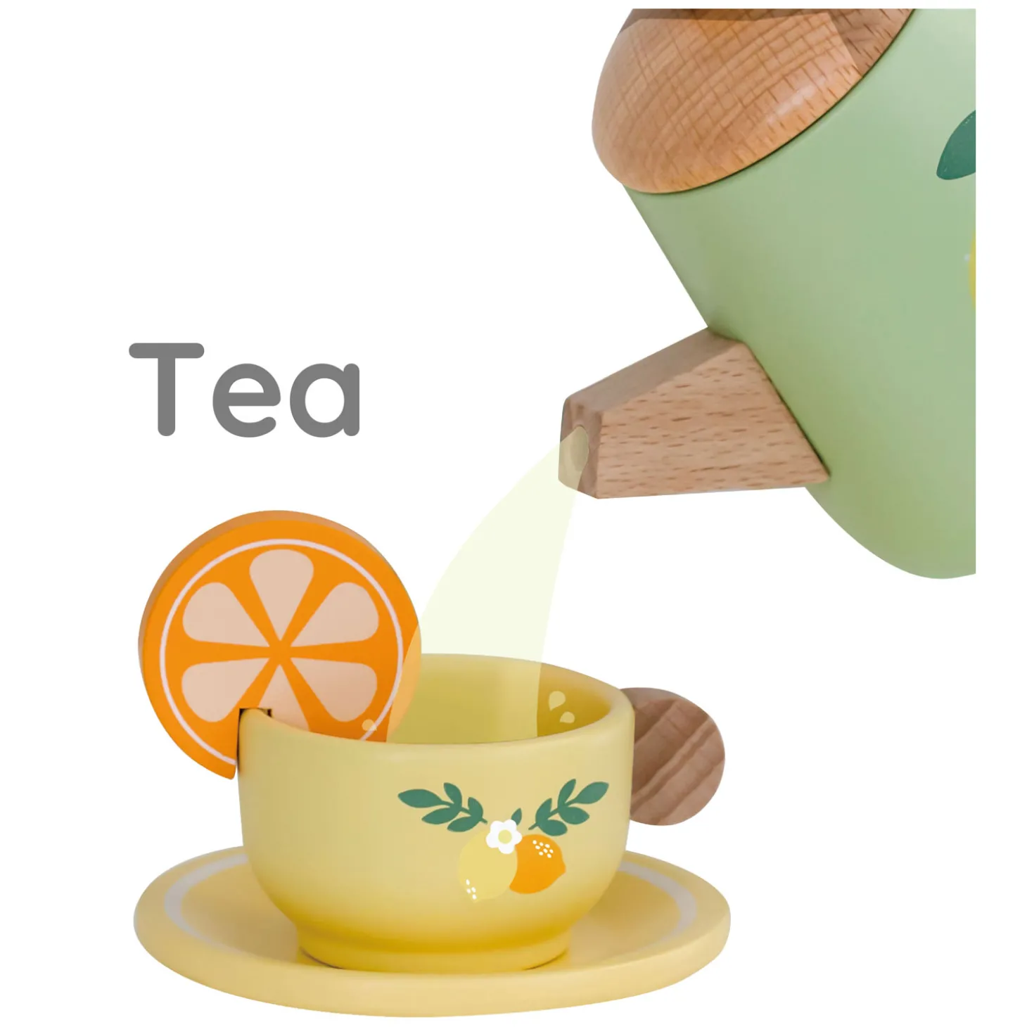 Gemaakt van robuust en duurzaam hout. Afmetingen: 27,5 x 22,4 x 9,2 centimeter. De theeset is geschikt voor kinderen vanaf 3 jaar oud.