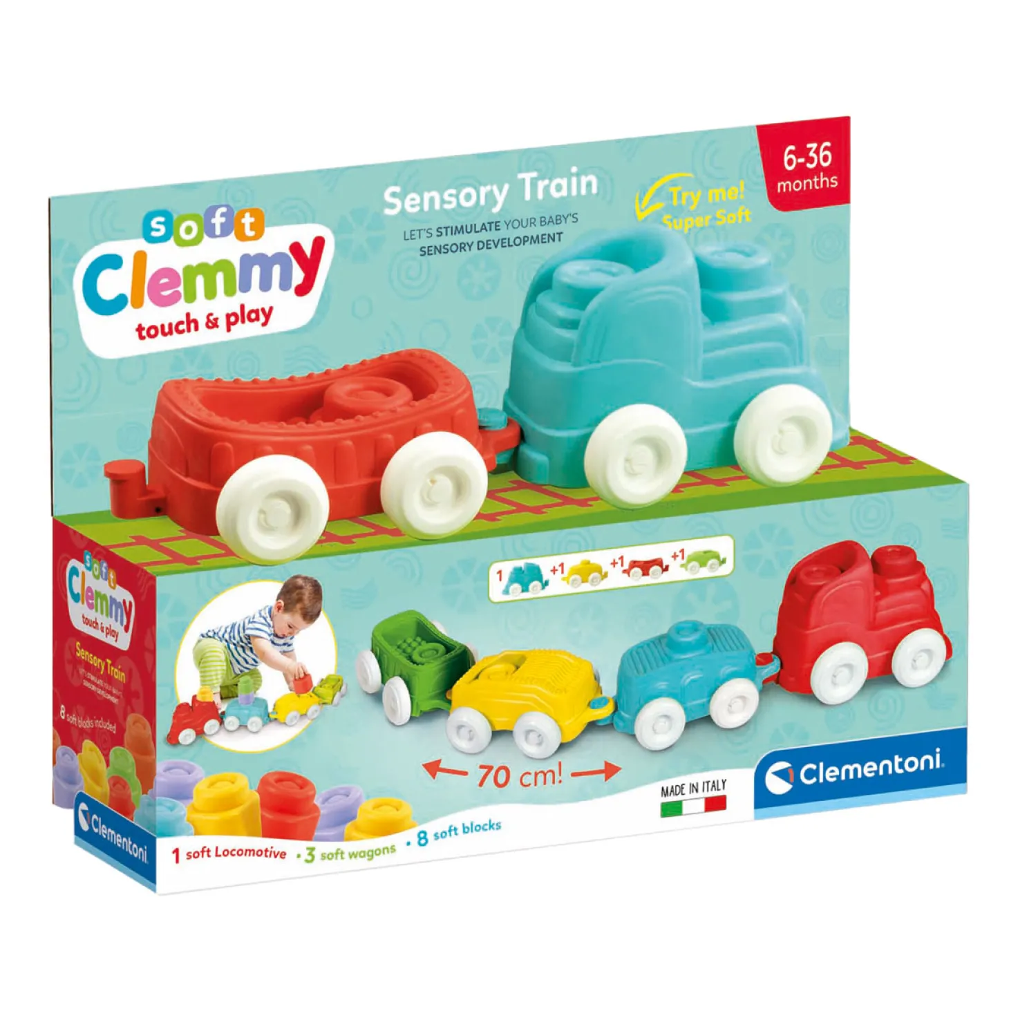 Een zachte trein met locomotief en wagons, waarmee je kan spelen en die je met je handjes kan ontdekken. Het kind ontdekt de reliëfs, de vormen, ervaart de zachtheid van het Clemmy-materiaal en geniet van een zintuiglijke ervaring die hem helpt zijn tastzin en handvaardigheid te ontwikkelen. De vele zachte, gekleurde blokken die op de wagons en de locomotief passen, of op elkaar, om zachte, gekleurde torens te maken die je telkens weer kunt laten vallen en opbouwen. De wagons kunnen worden losgekoppeld en aan elkaar worden verbonden. Dankzij de wielen kan de speelgoedtrein bewegen en hem samen met zijn wagons voortrekken, vele verhalen verzinnen en reizen met een grenzeloze fantasie. Vaatwasbestendig (max 70°).