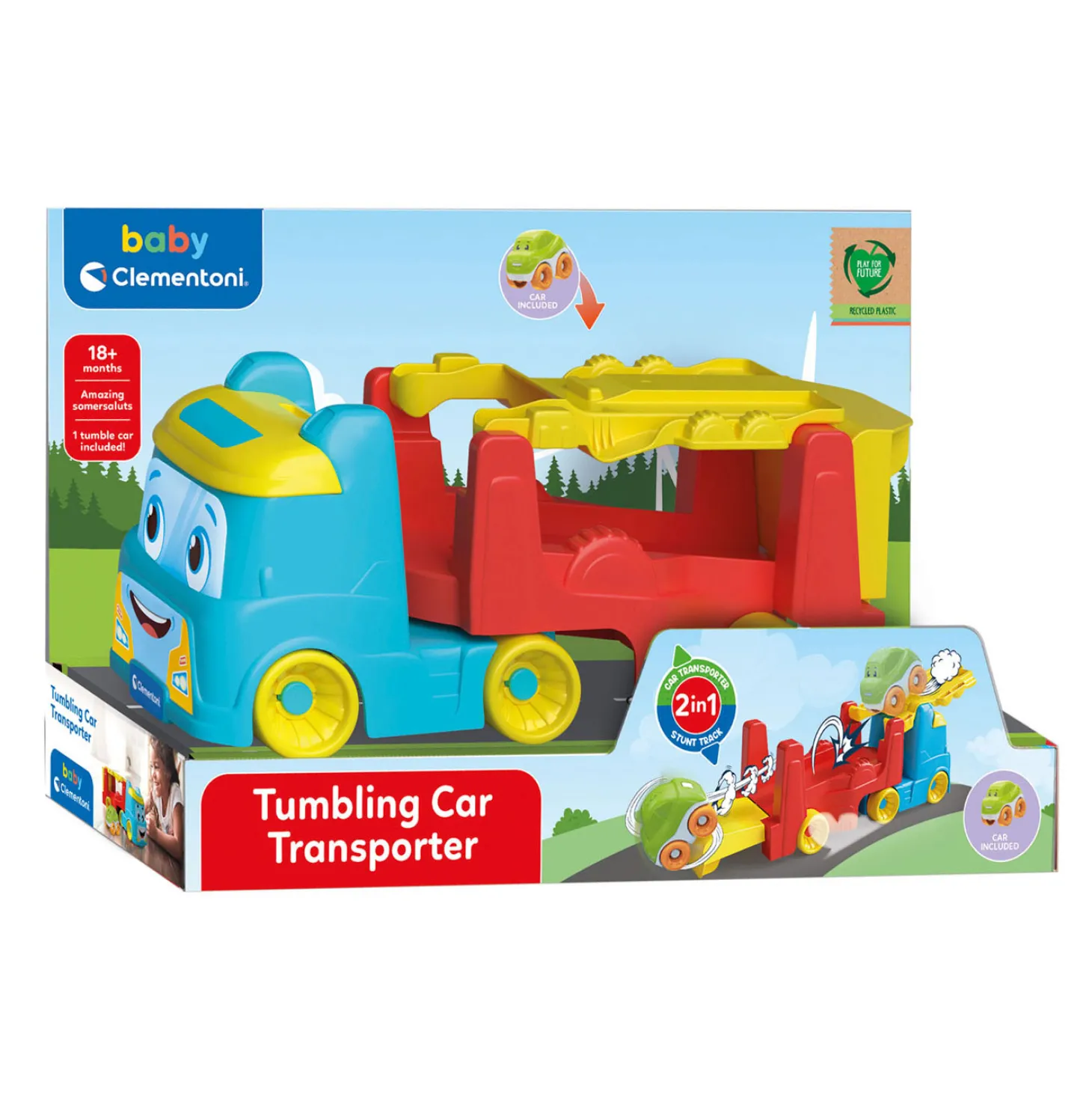De gekleurde vrachtwagen van Baby Clementoni wordt een autotransportvoertuig om de tuimelende auto’s in te vervoeren! Het autotransportvoertuig wordt een piste om de tuimelende auto te laten racen en rollen. De auto tuimelt en maakt hele leuke koprollen en stimuleert zo de nieuwsgierigheid van het kind. Het spel stimuleert de handvaardigheid en de verbeelding van het kind, die de vrachtwagen kan gebruiken om de omgevingen van de echte wereld na te bootsen. Uitbreidbaar spel. Ontdek alle kleuren van de tuimelende auto’s! Play for future: product vervaardigd uit 100% gerecycled materiaal.Prijs per stuk, verschillende uitvoeringen/kleuren worden door elkaar geleverd.