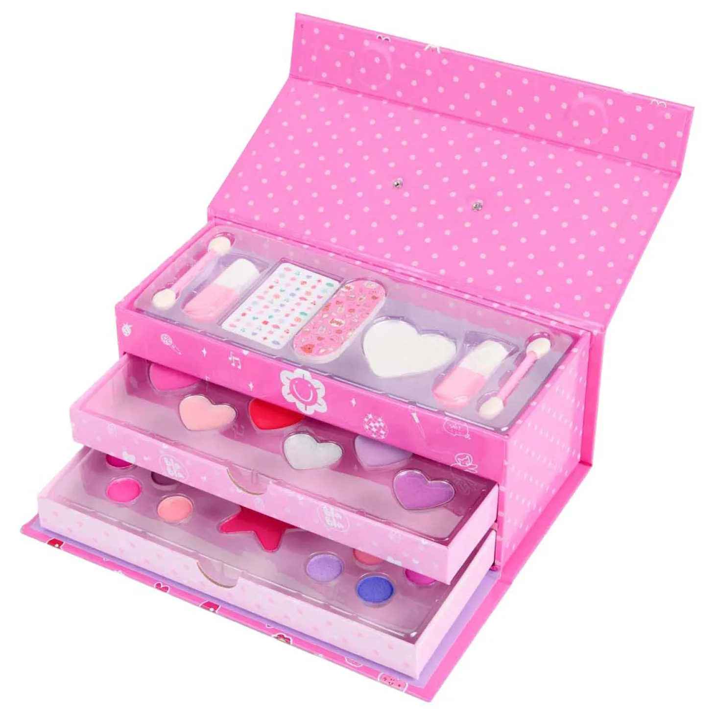 Bij het openvouwen van de beautycase ontdekken kinderen een schatkist vol beauty geheimen. De bovenste laag bevat vier zachte kwastjes, nagelstickers, een handige vijl en een betoverend hartvormig spiegeltje om ervoor te zorgen dat ze er altijd op hun best uitzien.