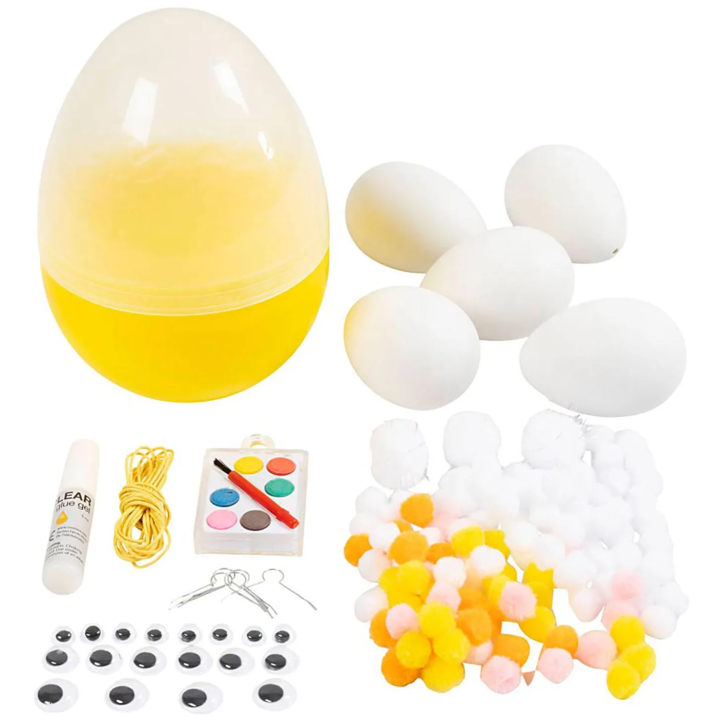 Inhoud: plastic ei, waterverfpalet met penseel, wiebelogen, pom-oms, lijm, touw en hanger.