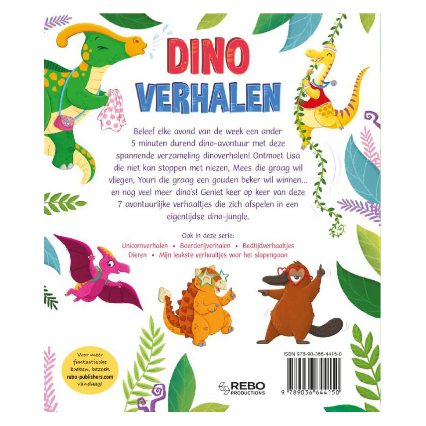 Beleef elke avond van de week een ander 5 minuten durend dino-avontuur met deze spannende verzameling dinoverhalen! Ontmoet Lisa die niet kan stoppen met niezen, Mees die graag wil vliegen, Youri die graag een gouden beker wil winnen… en nog veel meer dino’s! Geniet keer op keer van deze 7 avontuurlijke verhaaltjes die zich afspelen in een eigentijdse dino-jungle.