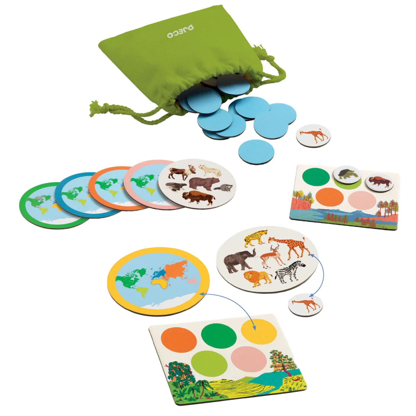 Inhoud: 6 ronde continent-kaarten, 6 lottoplankjes + 42 ronde dierenfiches en 1 stoffen tas.