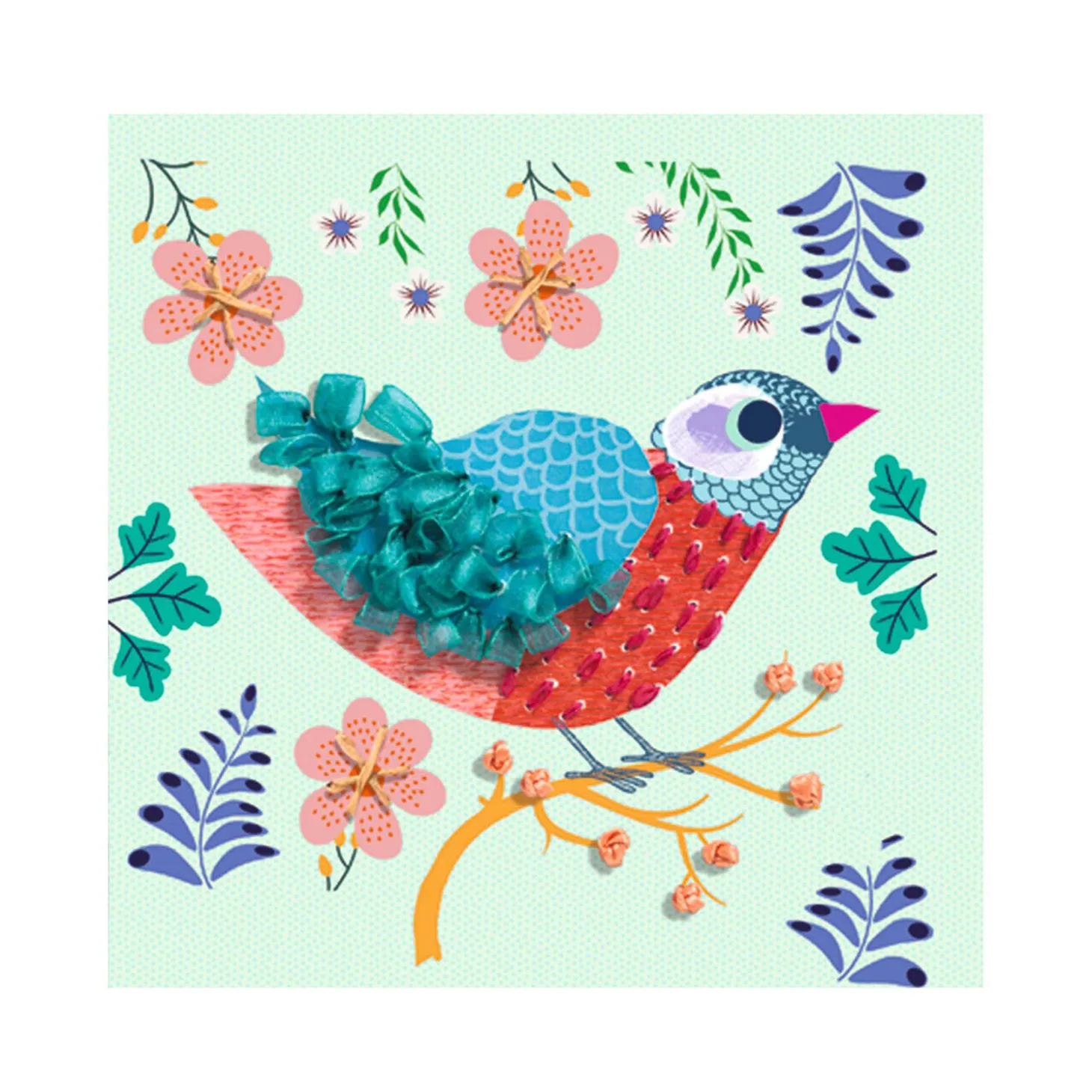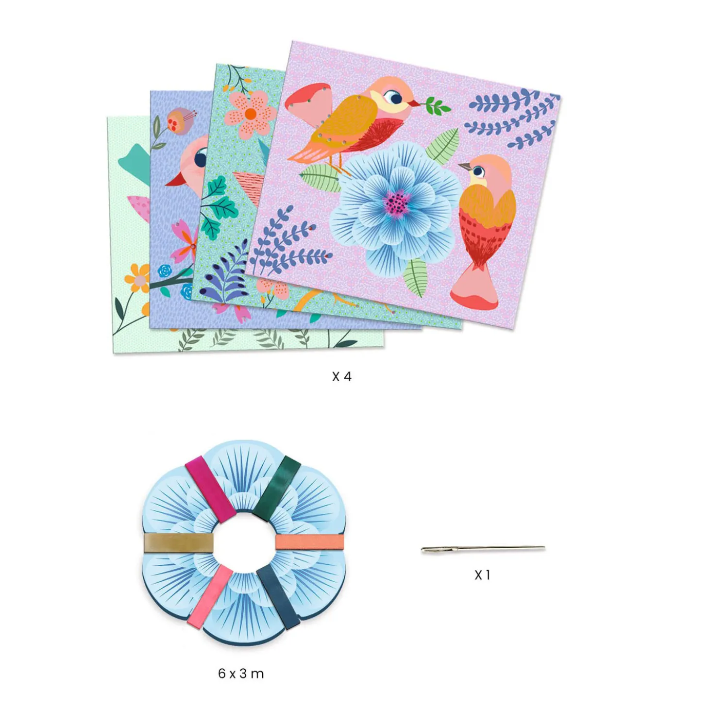 Inhoud: 4 geïllustreerde kaarten (14 x 16 cm), 1 assortiment gekleurde satijnen en organza linten (3 m / kleur), 1 naald met ronde punt, 1 gekleurd stap-voor-stap boekje.