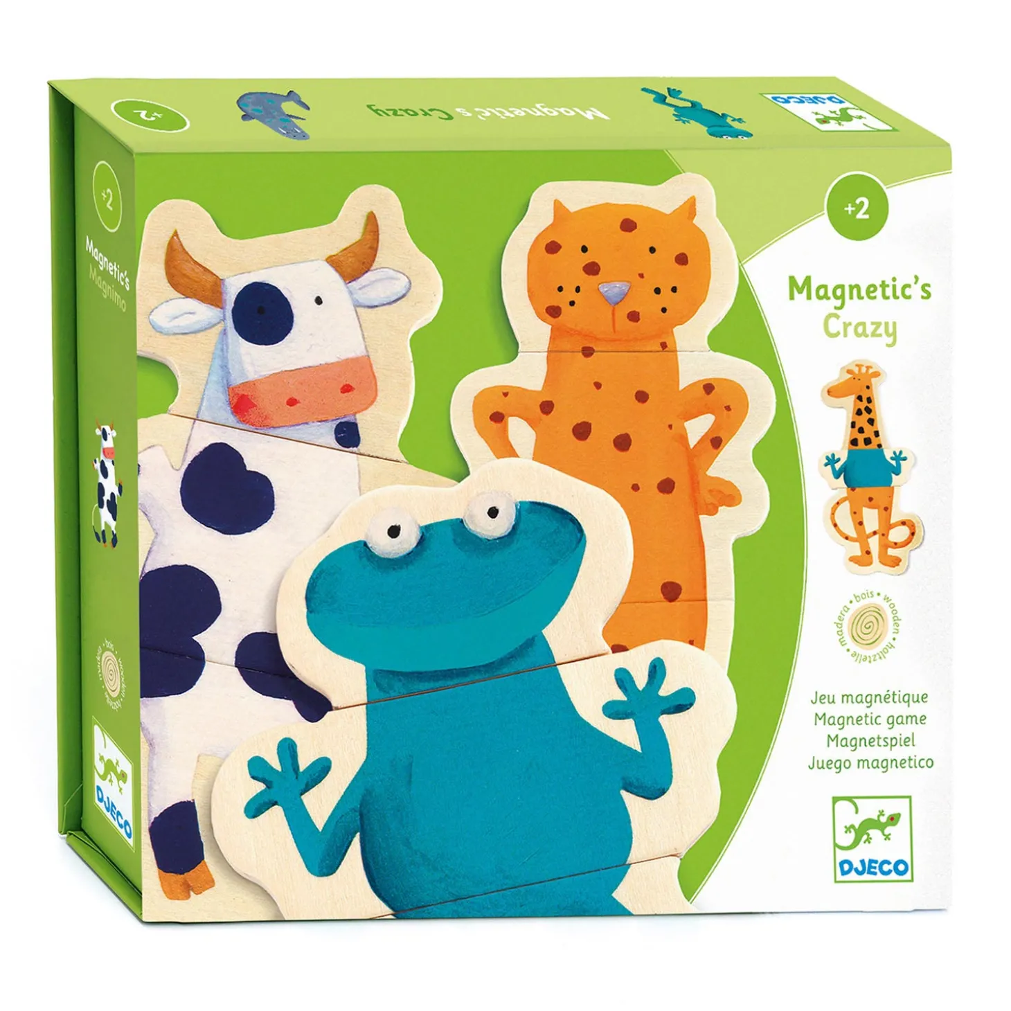 Combineer de gekste dieren met de dierenmagneten van Djeco. De houten magneten zijn steeds verdeeld in drie delen. Daardoor kun je het hoofd van de giraffe combineren met de buik van de wolf en de poten van de krokodil. Dat is een gek gezicht! Zulke gekke dieren heb je nog nooit gezien. Puzzel er verder op los en ontdek welke dieren je nog meer kunt combineren en hoe dat er uitziet. Totaal zijn er 8 dieren in deze handig opbergdoos: een krokodil, een wolf, een luipaard, een koe, een giraffe, een hert, een walrus en een kikker.