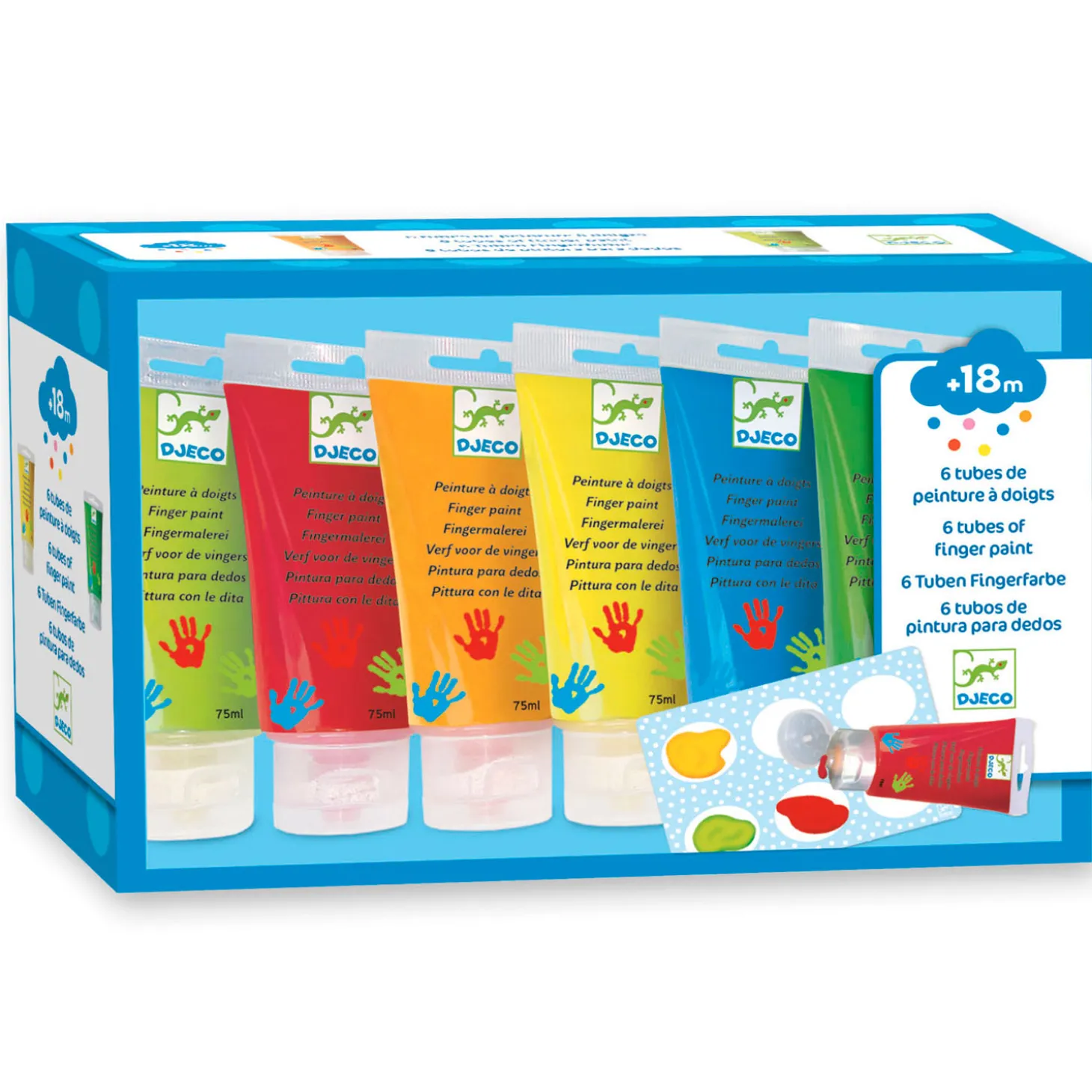 Vingerverf van DJECO, veilig én uitwasbaar, voor peuters vanaf 18 maanden. Uitwasbare vingerverf is wel zo handig voor peuters en kleuters die graag creatief bezig zijn! De set bestaat uit 6 verschillende kleuren vingerverf 75 ml per tube en een hardplastic placemat om de vingerverf op te spuiten.