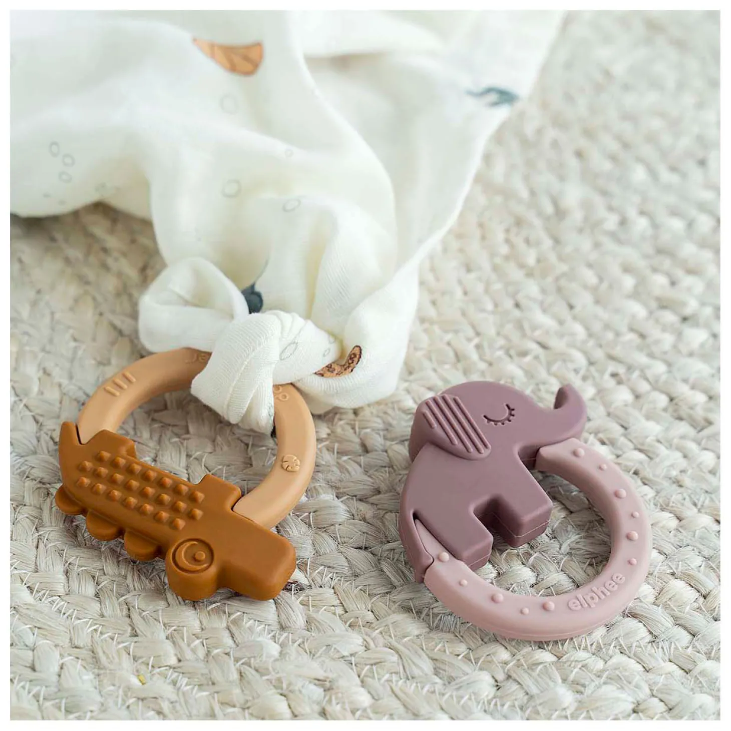 De bijtset is zo ontworpen dat hij zelfs in het kleinste handje past en stimuleert zowel de visuele, orale als tactiele zintuigen van de baby. De zachte poeder- en mosterdtinten, leuke texturen en de schattige olifant en leuke krokodil maken deze set tot het perfecte eerste speeltje.