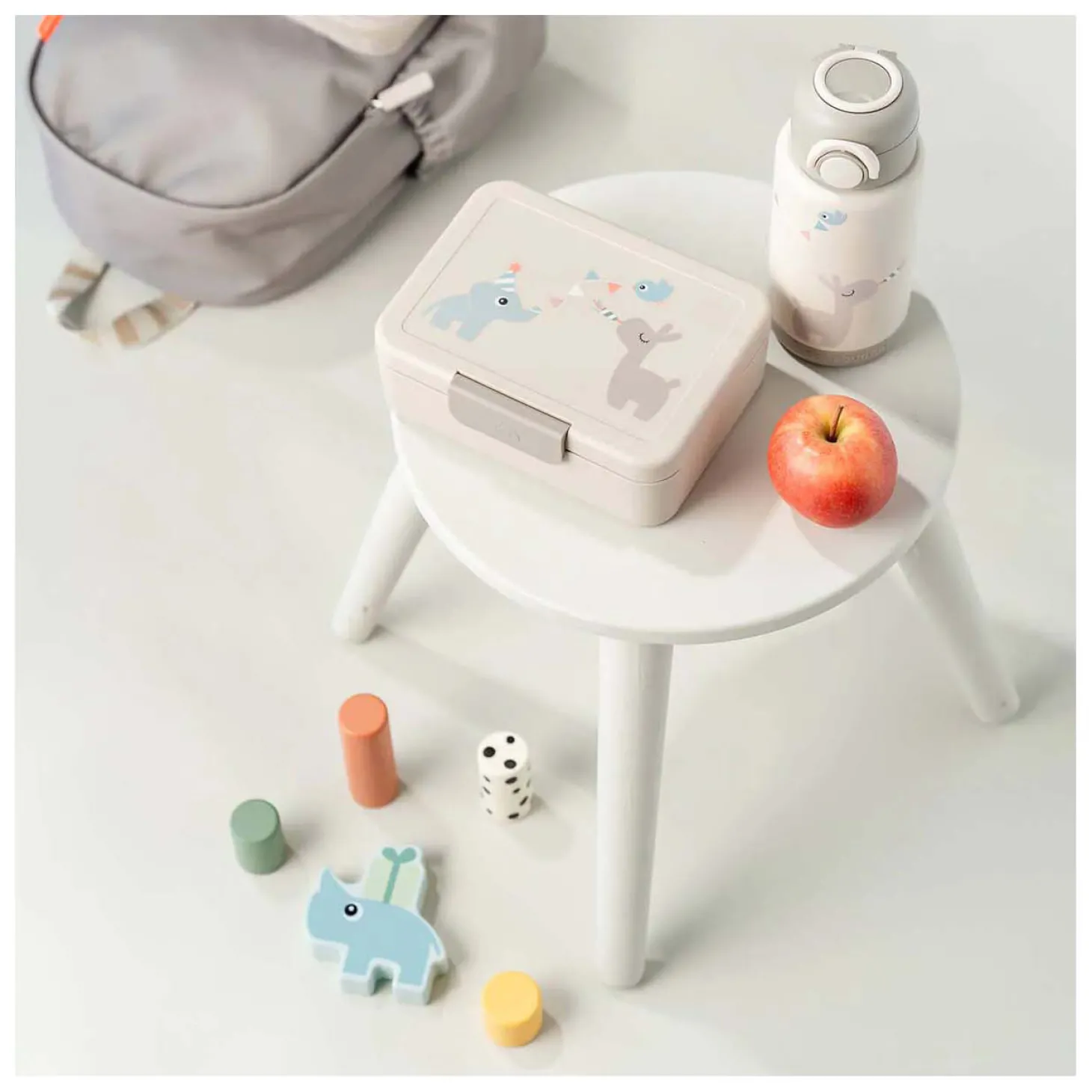 De lunchbox heeft een zachte zandkleur en is versierd met Elphee, Lalee en Birdee – de vrolijke Deer vriendjes die van elke lunch een feestje maken!