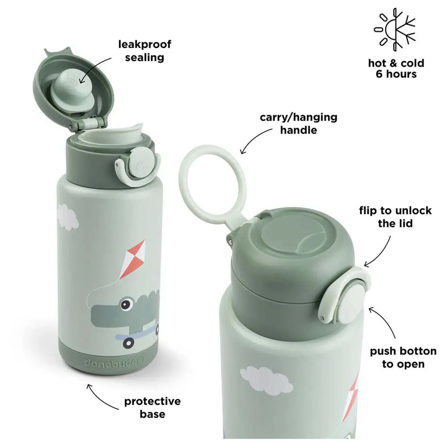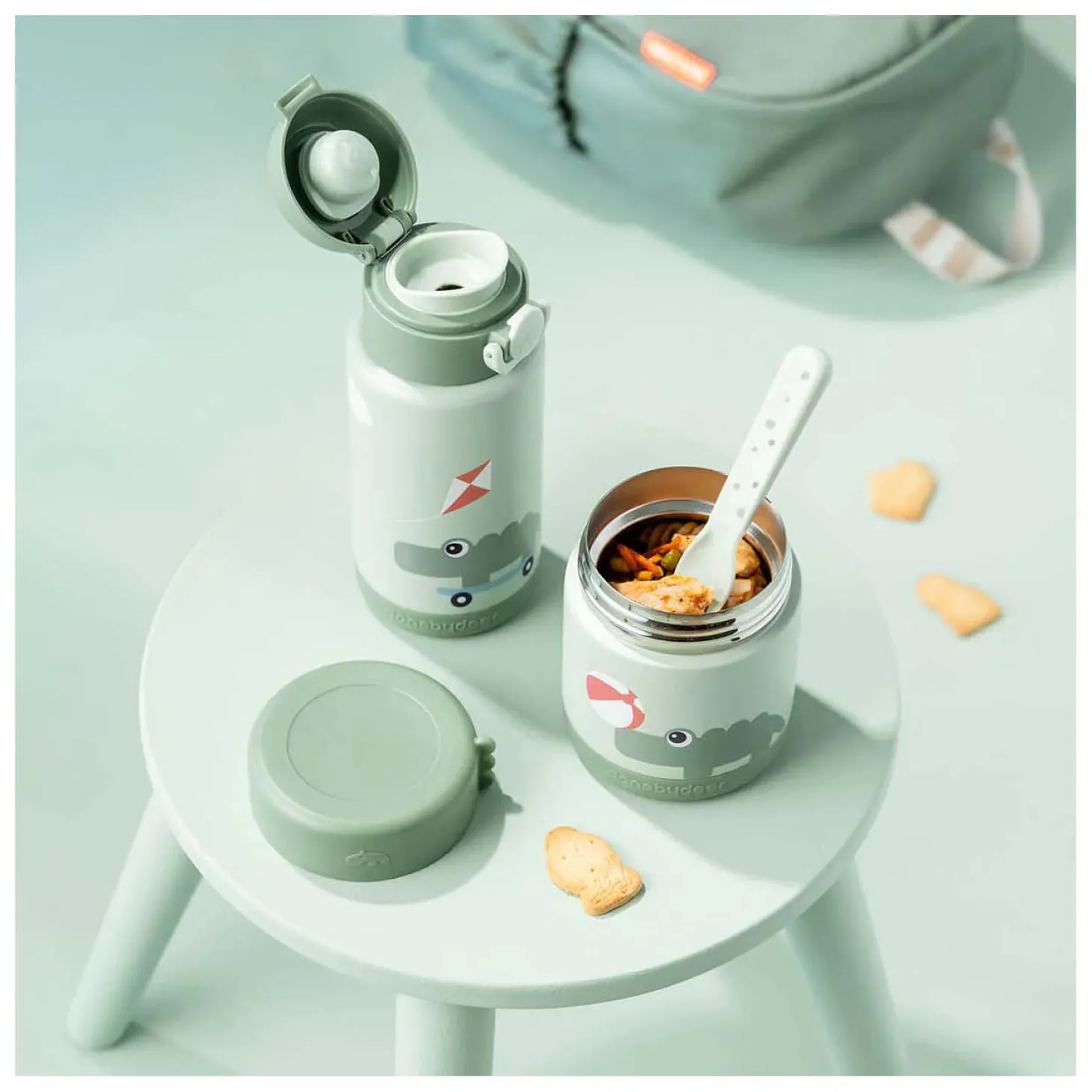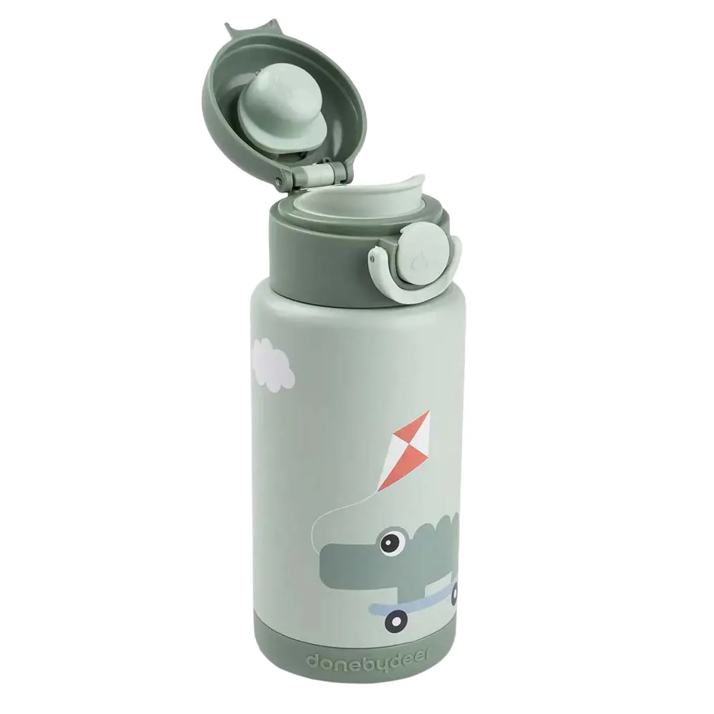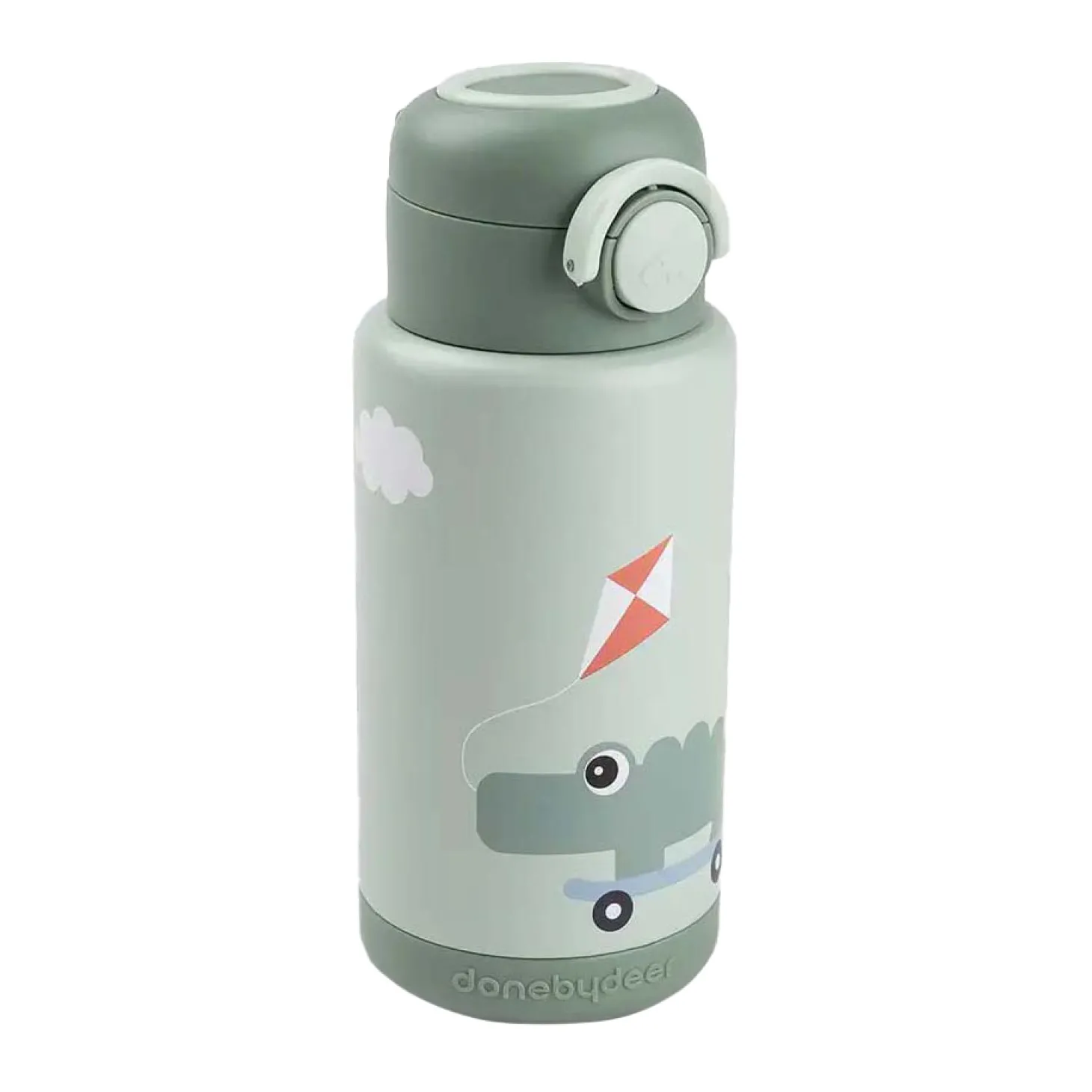 Deze lichtgroene fles heeft een speelse Croco en Birdee-print – de perfecte metgezellen voor slokjes onderweg.