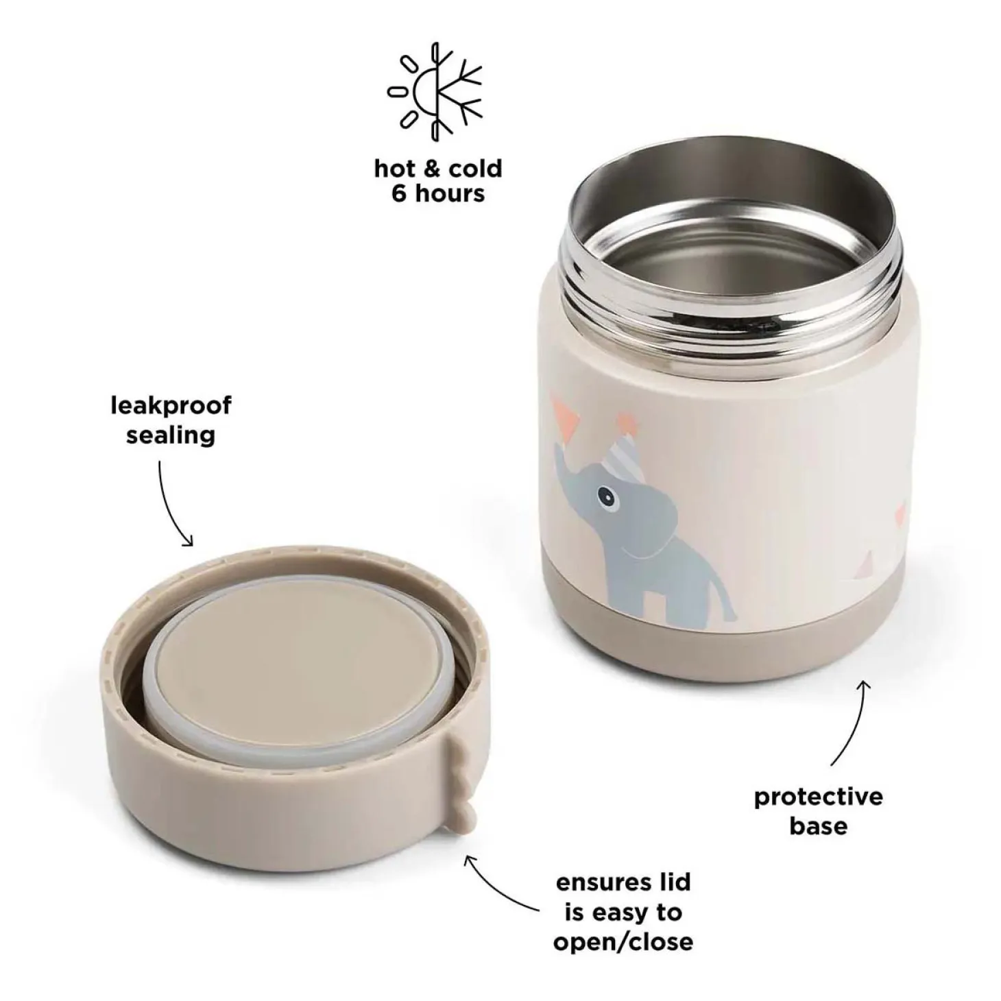 De doordacht ontworpen brede opening maakt het gemakkelijk om te vullen, eruit te eten en schoon te maken – perfect voor zowel ouders als kleine eters. Met een inhoud van 300 ml is hij precies de juiste maat voor kleine porties warme maaltijden of gekoelde snacks gedurende de dag – van ontbijt tot middagpauze.