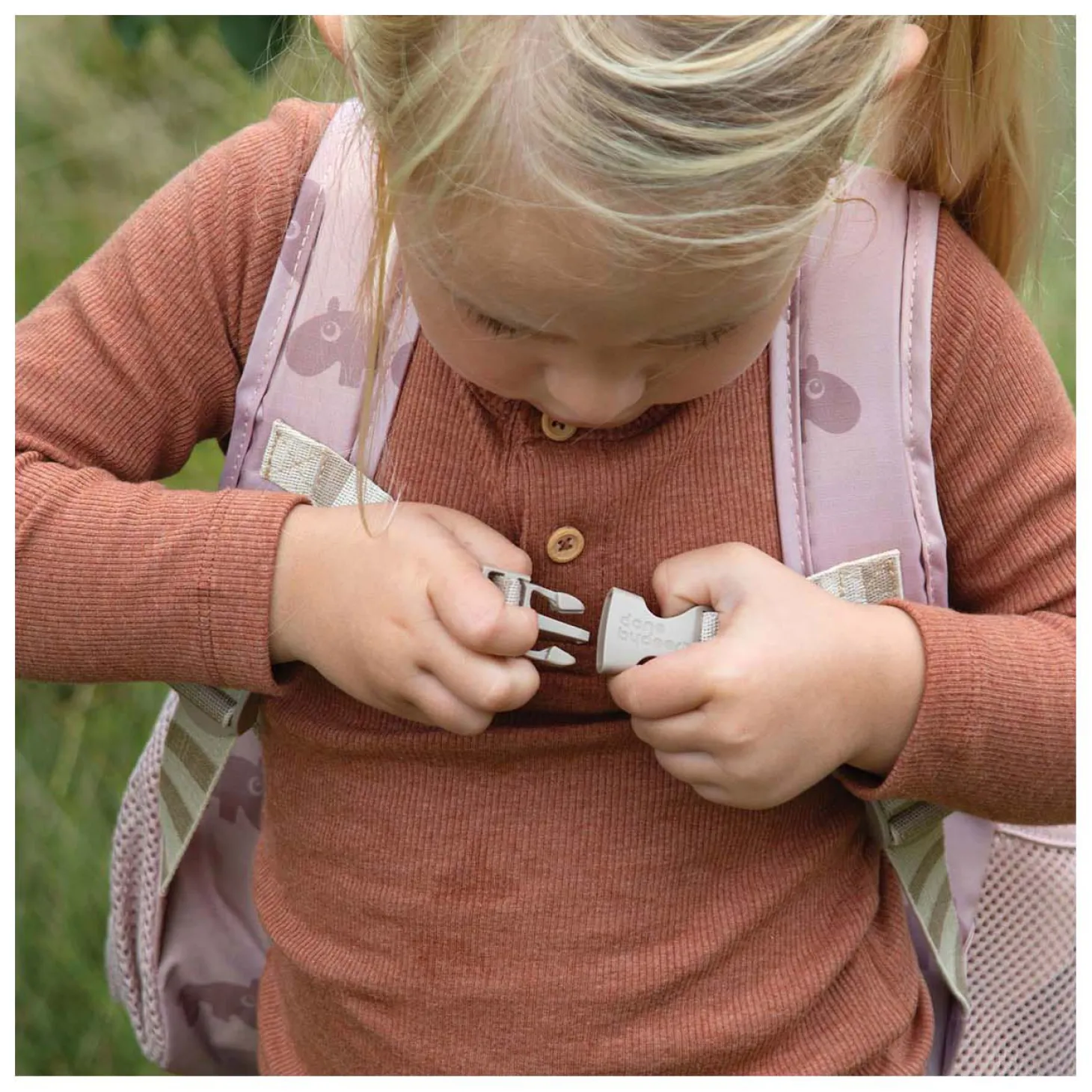 De rugzak heeft een grote ruimte waar gemakkelijk een broodtrommel, kleren en alle bijzondere vondsten in passen die je kind onderweg opdoet. Hij heeft twee zijvakken met elastiek waar een fles in past en een voorvak.