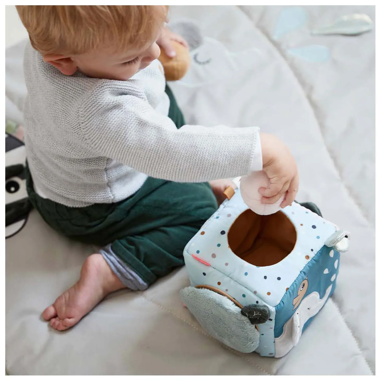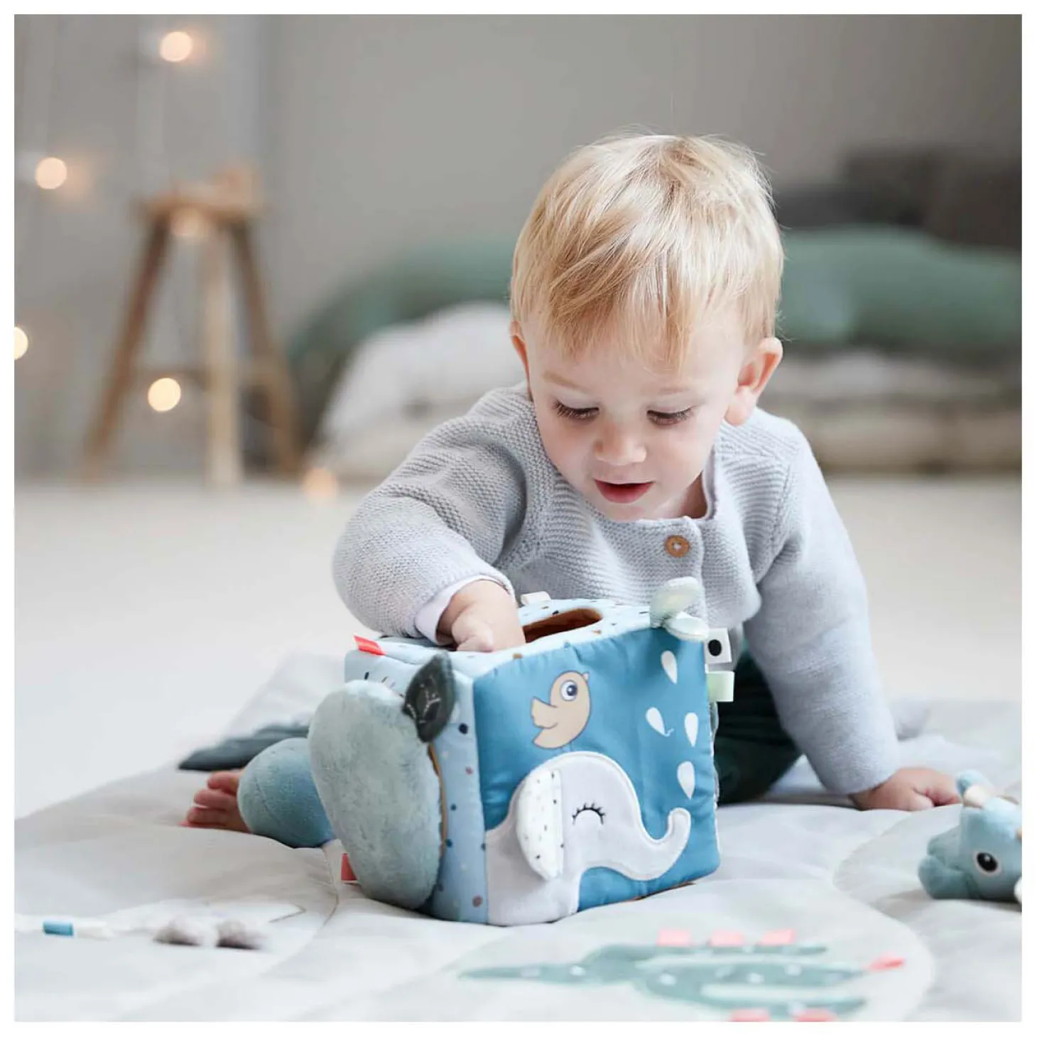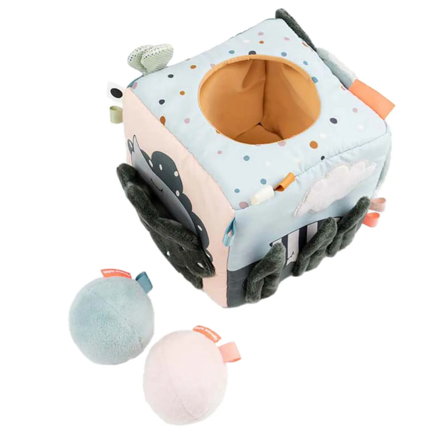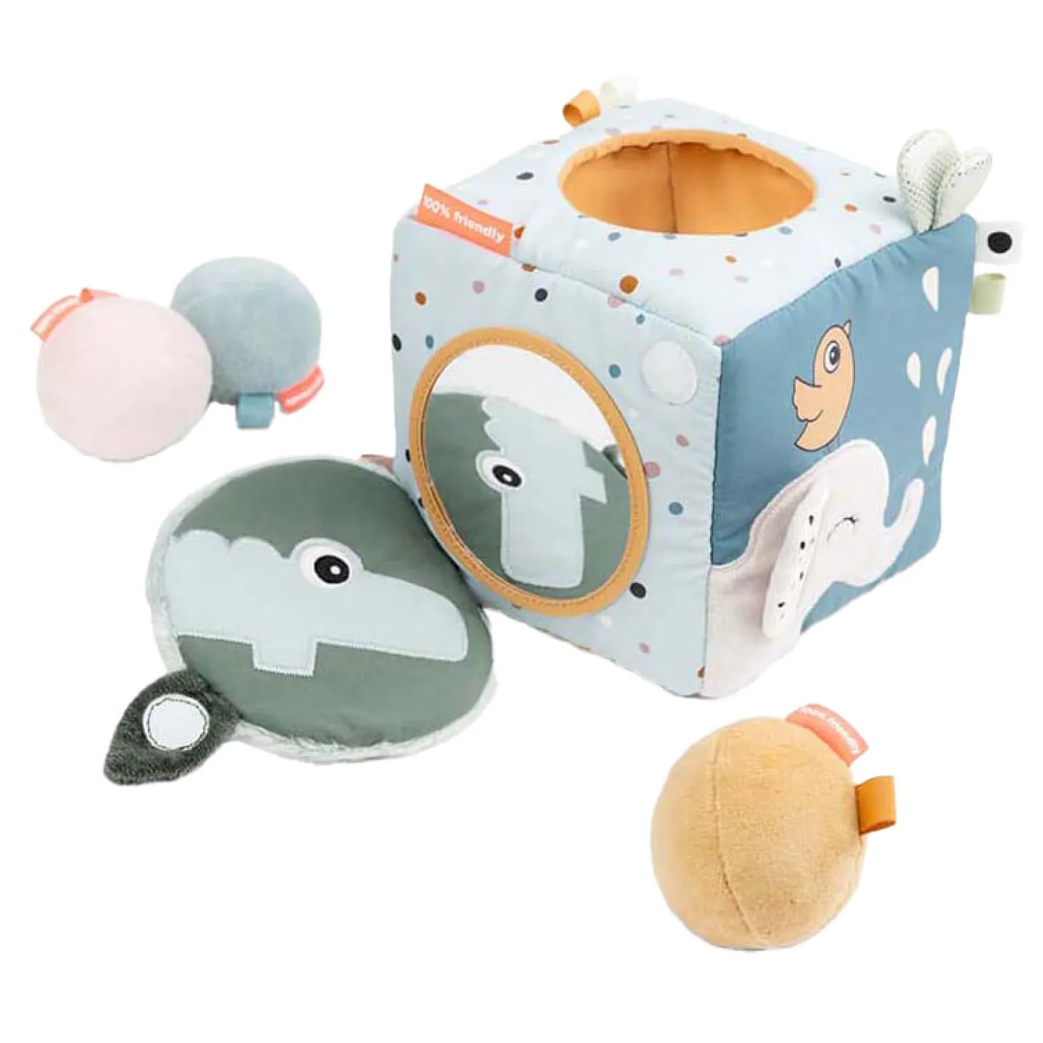 Bladeren die knisperen, een zachte babyspiegel en Croco die zich achter de deur verstopt zijn slechts enkele van de coole functies van deze kubus. Verstop je eigen schatten in de kubus of gebruik de drie knijpbare rammelballen in schattige kleuren die zijn inbegrepen.