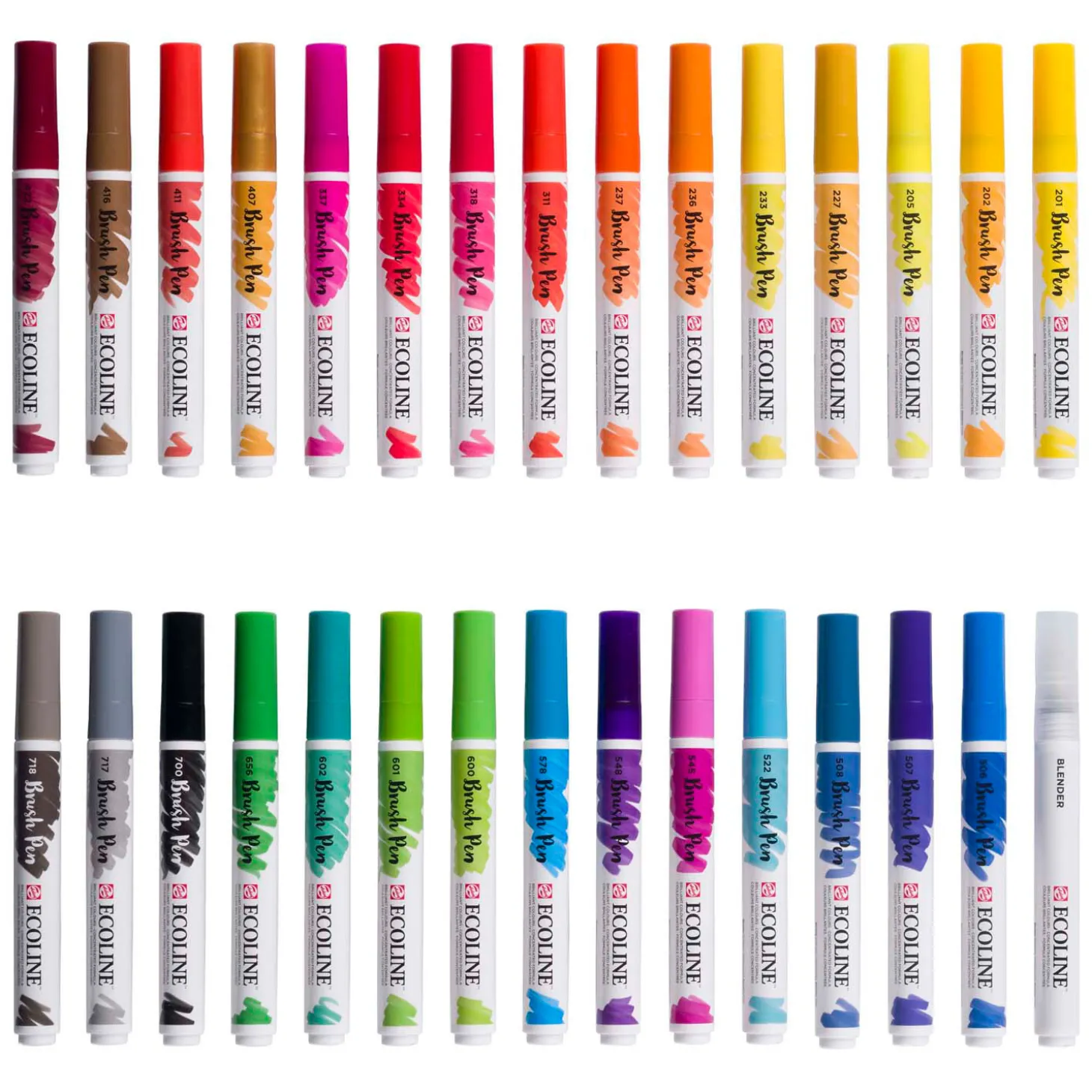 Inhoud: 30 Brush Pens (201 Lichtgeel – 202 Donkergeel – 205 Citroengeel (Primair) – 227 Gele Oker – 233 Chartreuse – 236 Lichtoranje – 237 Donkeroranje – 311 Vermiljoen – 318 Karmijn – 334 Scharlaken – 337 Magenta – 407 Donkere Oker – 411 Sienna Gebrand – 416 Sepia – 422 Roodbruin – 506 Ultramarijn Diep – 507 Ultramarijnviolet – 508 Pruisischblauw – 522 Turkooisblauw – 545 Roodviolet – 548 Blauwviolet – 578 Hemelsblauw (Cyaan) – 600 Groen – 601 Lichtgroen – 602 Donkergroen – 656 Woudgroen – 700 Zwart – 717 Koudgrijs – 718 Warmgrijs – 902 Blender).
