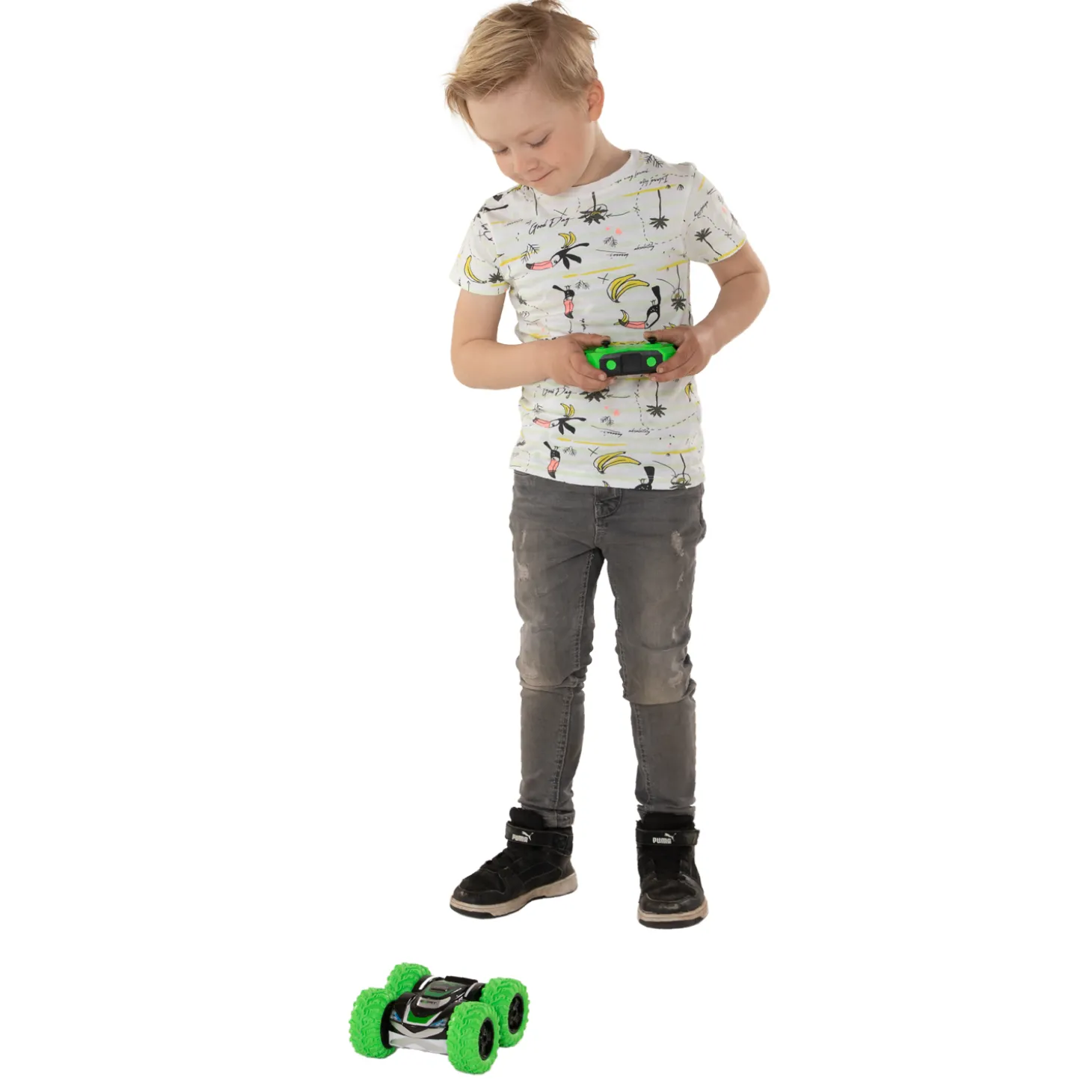 Afmeting verpakking: 28x10x26 cm (lxbxh). Batterij informatie: Auto 4 x AA (niet meegeleverd) – Controller: 2 x AAA batterijen (niet meegeleverd).