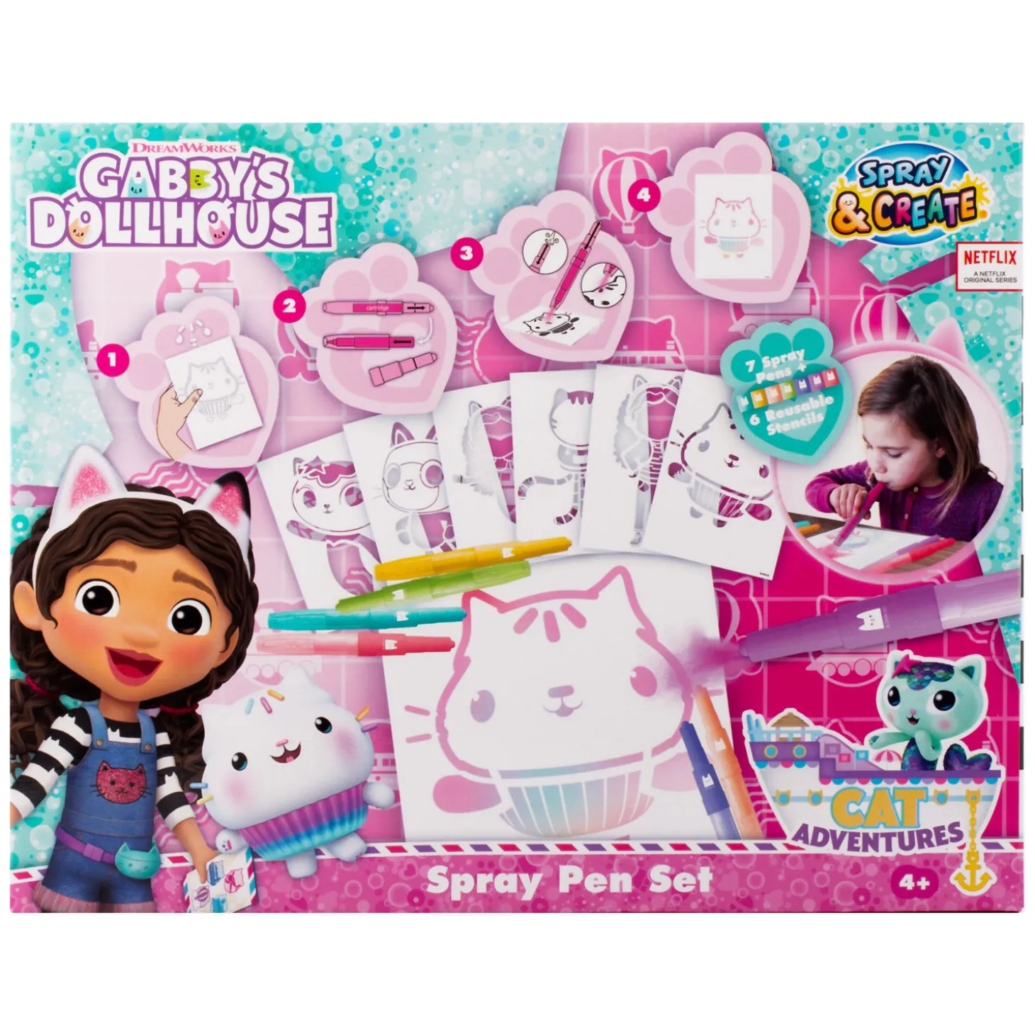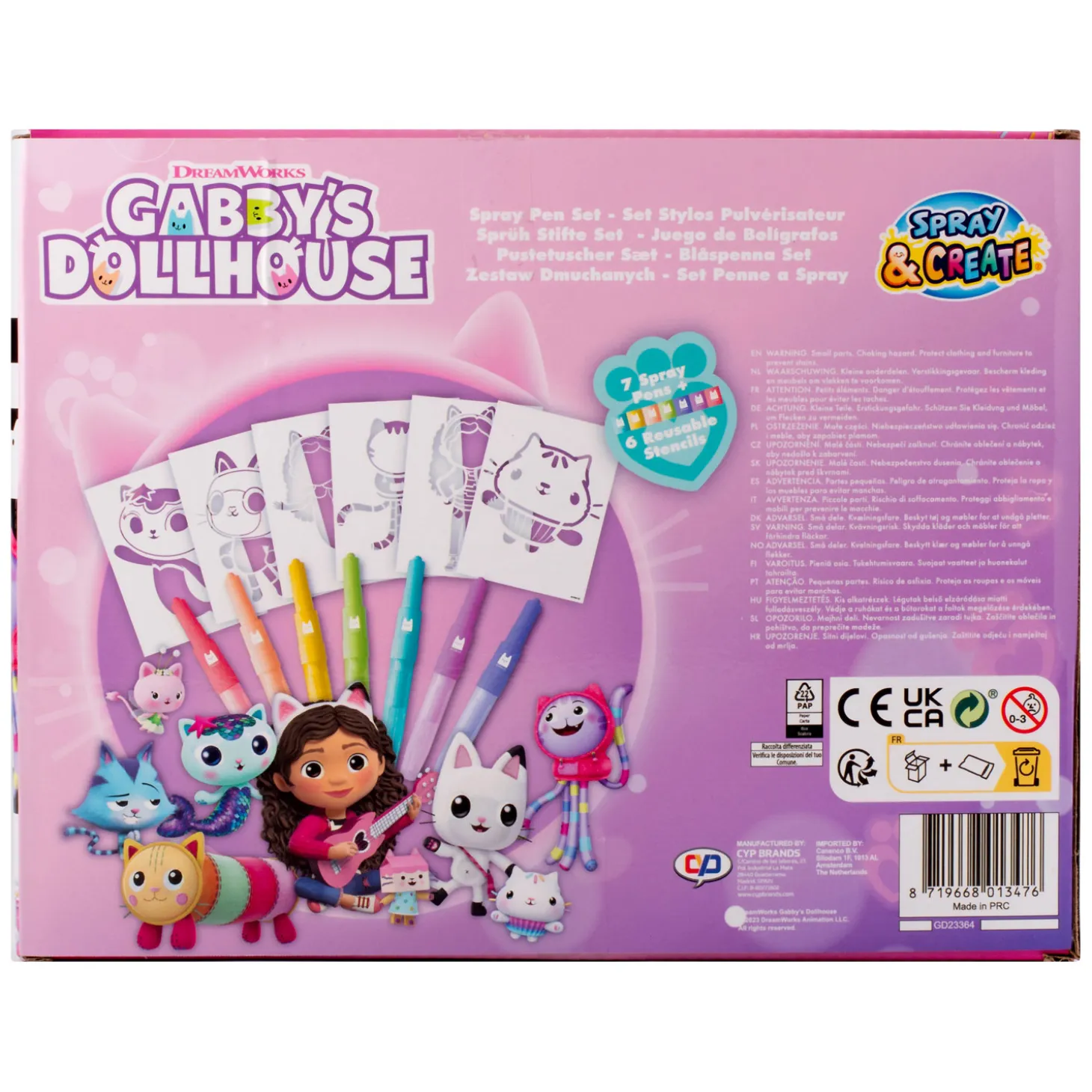 Inclusief in het set zijn 6 herbruikbare stencils, elk geïnspireerd door de geliefde karakters uit de serie Gabby’s Poppenhuis.. Laat de creativiteit de vrije loop terwijl kinderen keer op keer unieke meesterwerken maken met deze adembenemende spray pennen.