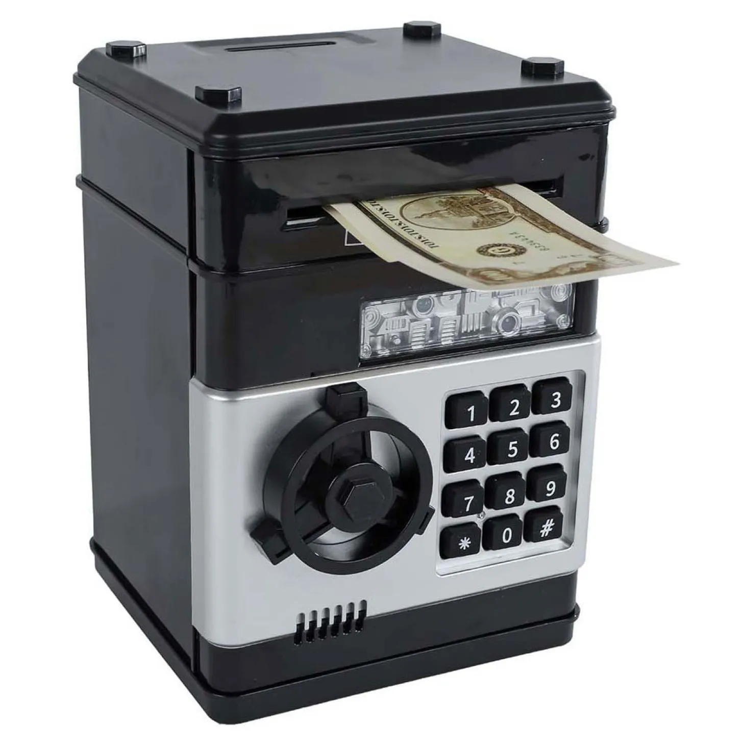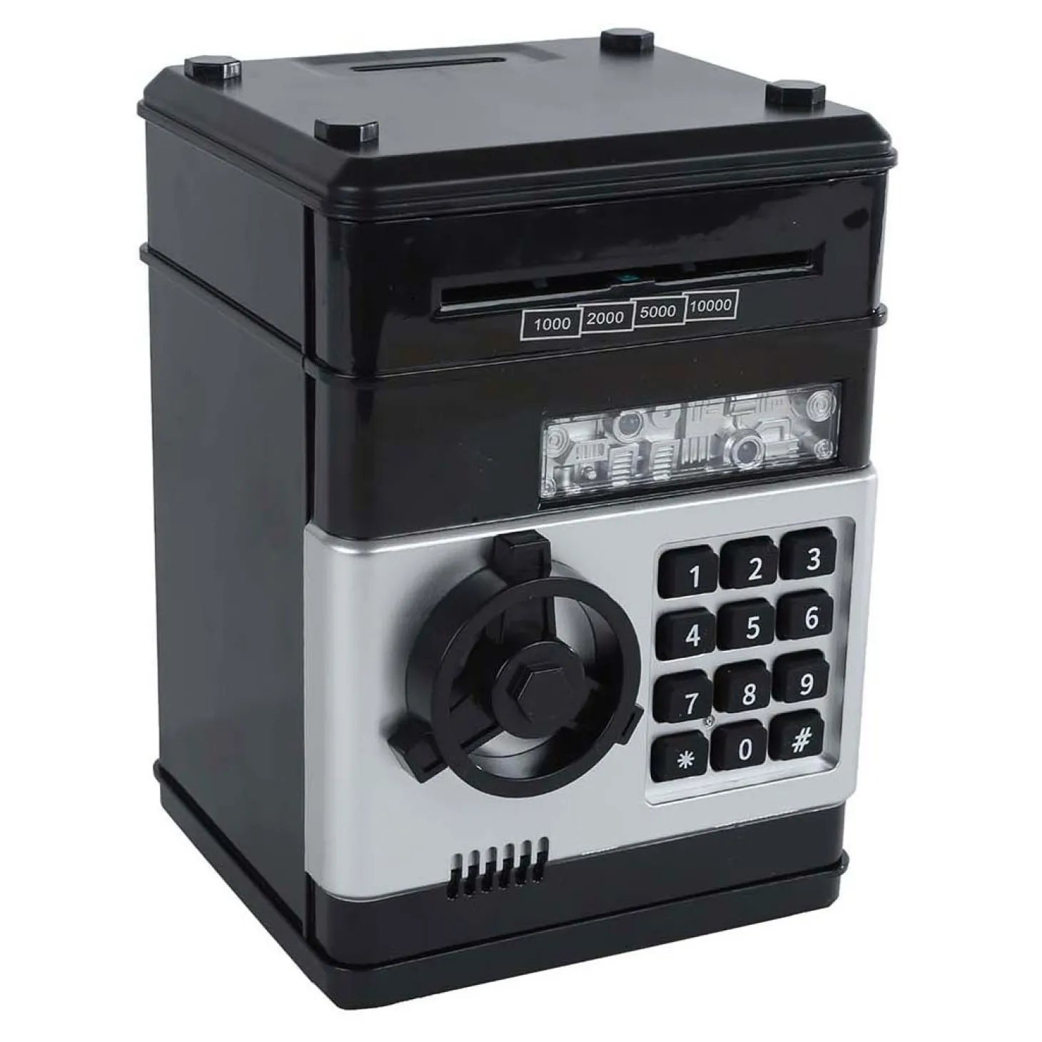 De kluis heeft licht en geluid, en is 19,5 cm groot.