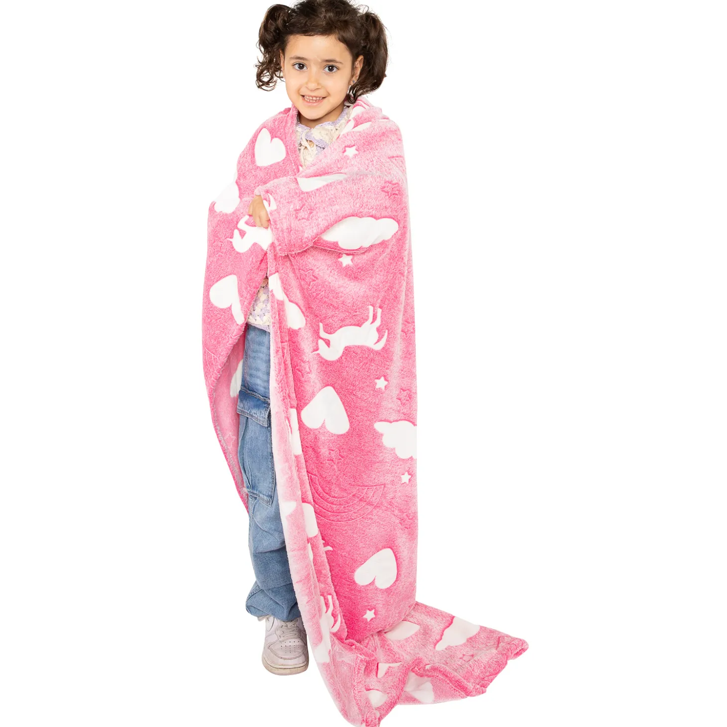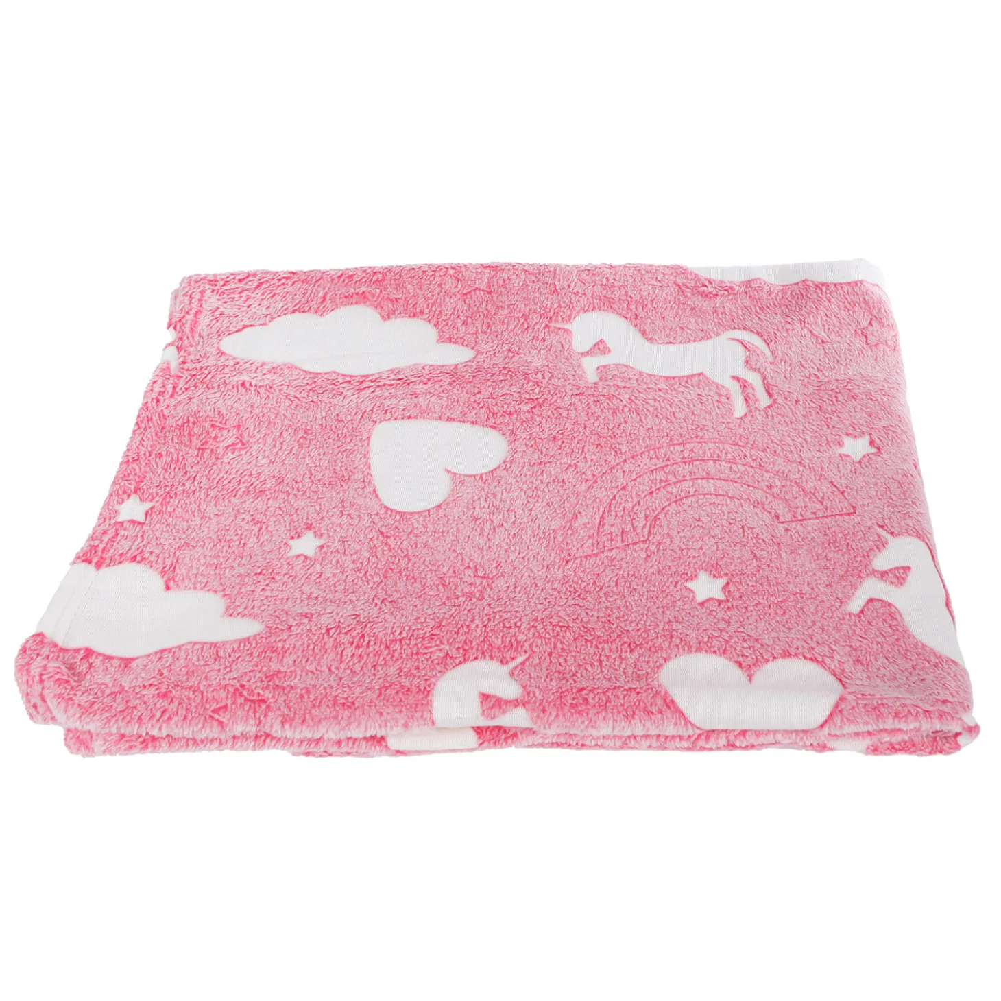 Heerlijk zachte en warme unicorndeken van 100 x 150 centimeter groot. De deken is roze en bedrukt met witte eenhoorns, die in het donker oplichten dankzij het glow-in-the-dark effect. Een heerlijk knuffelig cadeau voor unicornfans!