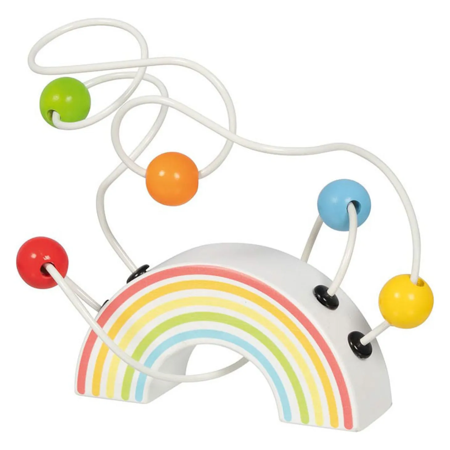 Wat een vrolijke kralendoolhof/motoriekspiraal! Deze kralenbaan zit op een kleurrijke regenboog bevestigd. De kronkelende, metalen baan gaat met allerlei gekke bochten onder, over en langs de regenboog. Kinderen kunnen de gekleurde kralen duwen, trekken, en sorteren terwijl ze tegelijkertijd hun fijne motoriek trainen. Ontzettend fascinerend voor kinderen vanaf 12 maanden oud!