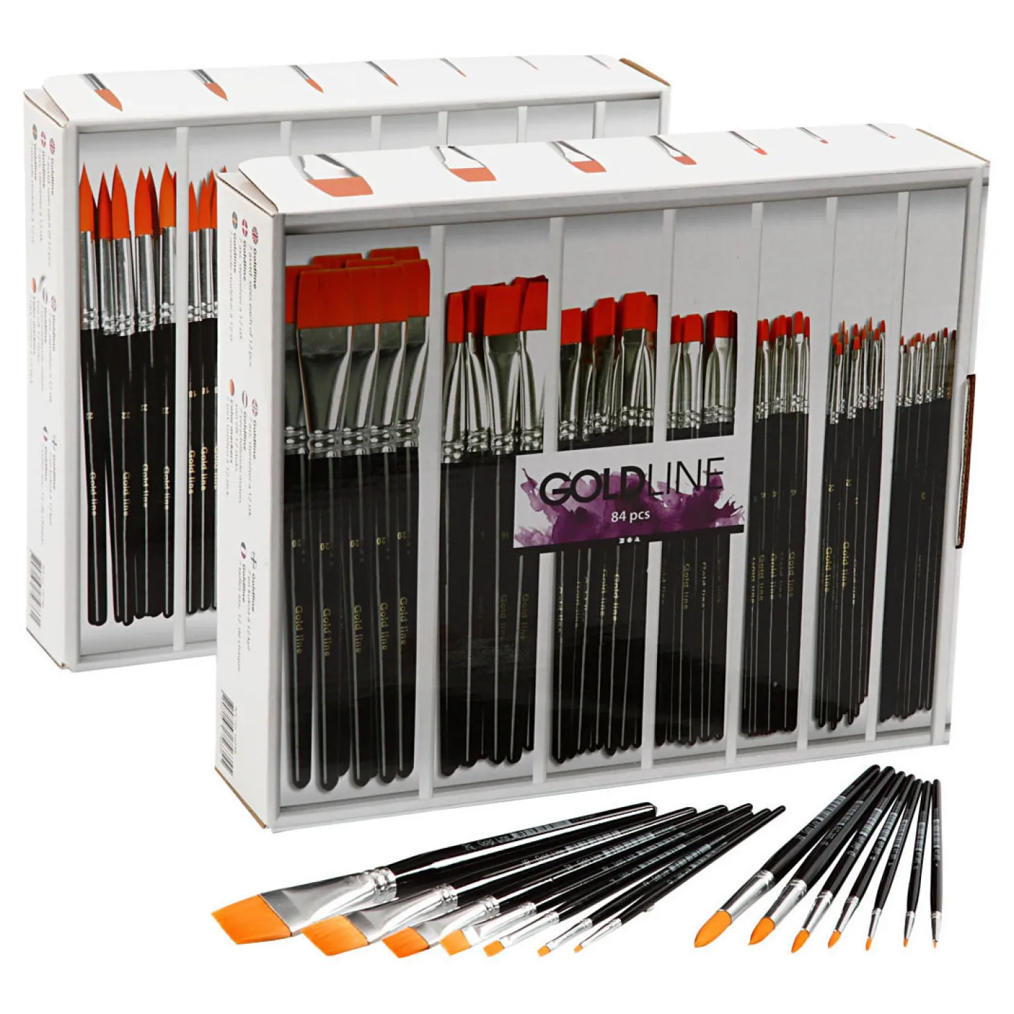 Reinig de penselen na gebruik in lauw water en laat ze drogen �?? of leg ze in een penseelreiniger met de kwasten naar beneden gericht.Inhoud: 2 opslagdozen met 84 ronde en 84 platte kwasten in diverse maten