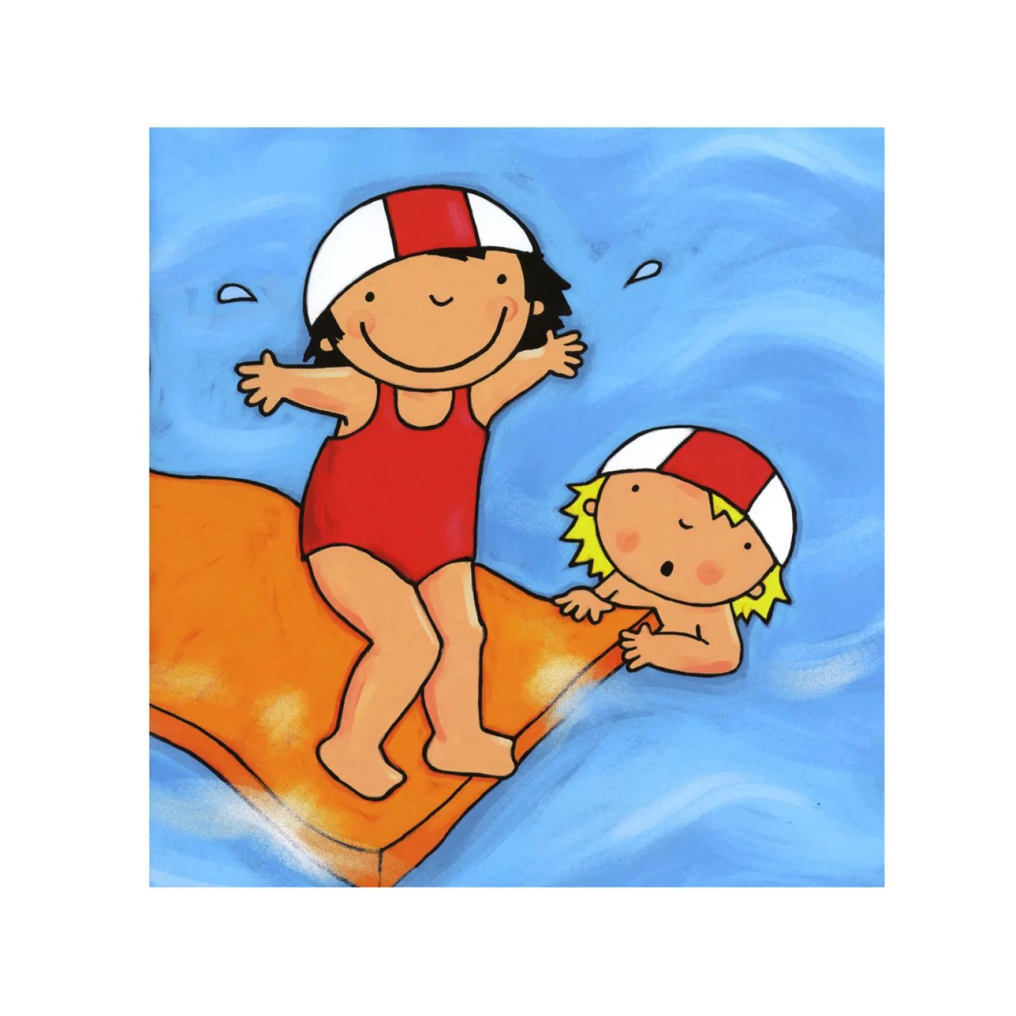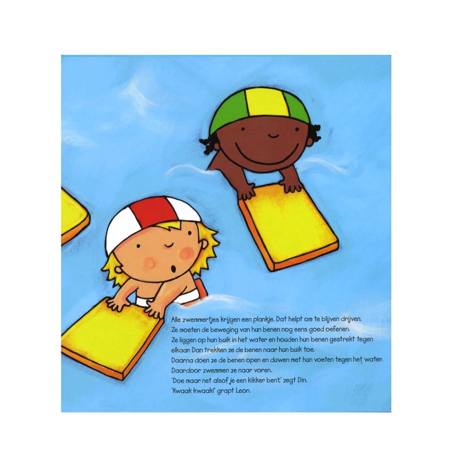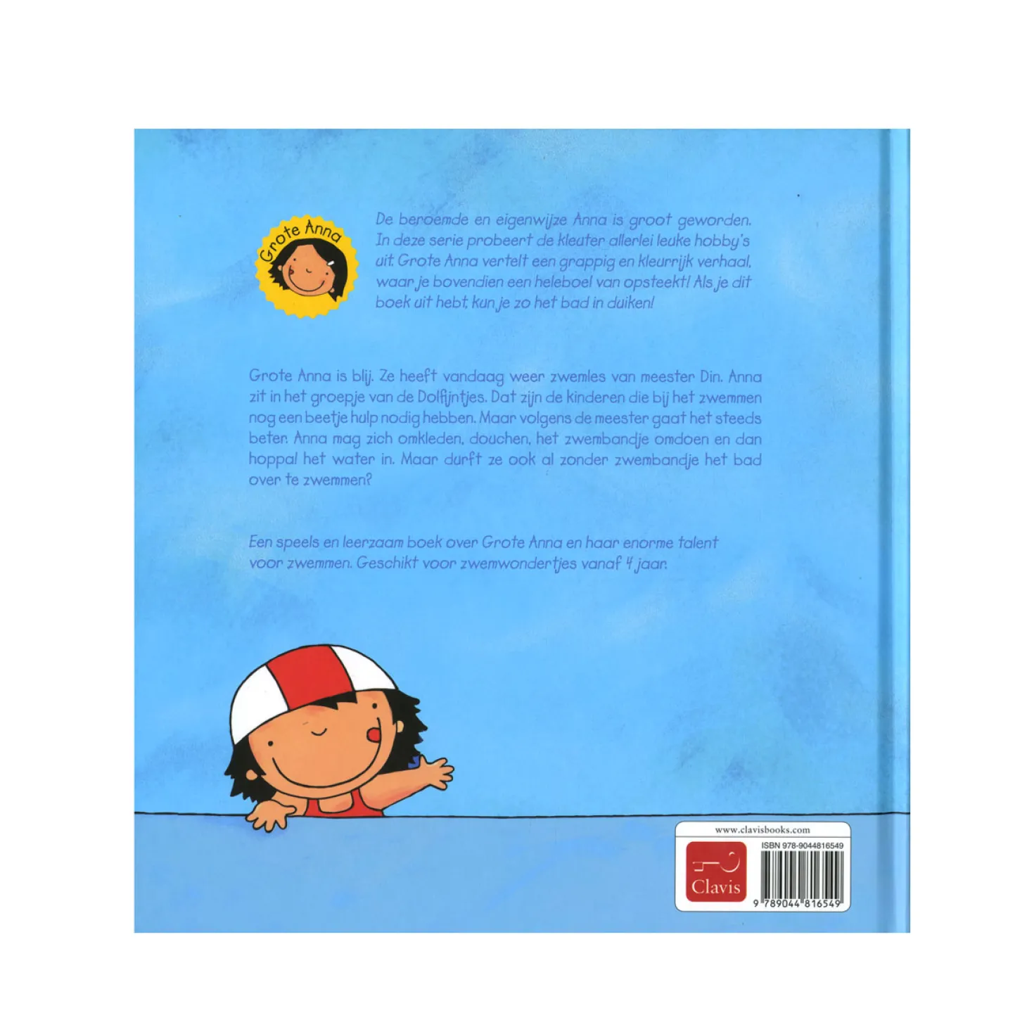 Grote Anna is blij. Ze heeft vandaag weer zwemles van meester Din. Anna zit in het groepje van de dolfijntjes. Dat zijn de kinderen die nog leren zwemmen. Maar volgens de meester gaat het steeds beter. Anna mag zich omkleden, douchen, het zwembandje omdoen en dan hop! het water in. Maar durft ze ook al zonder zwembandje het bad over te zwemmen? Â Een speels en leerzaam boek over Grote Anna en haar talent voor zwemmen. Geschikt voor waterliefhebbers vanaf 4 jaar. Herkenbaar voor kleuters die zelf op zwemles gaan.